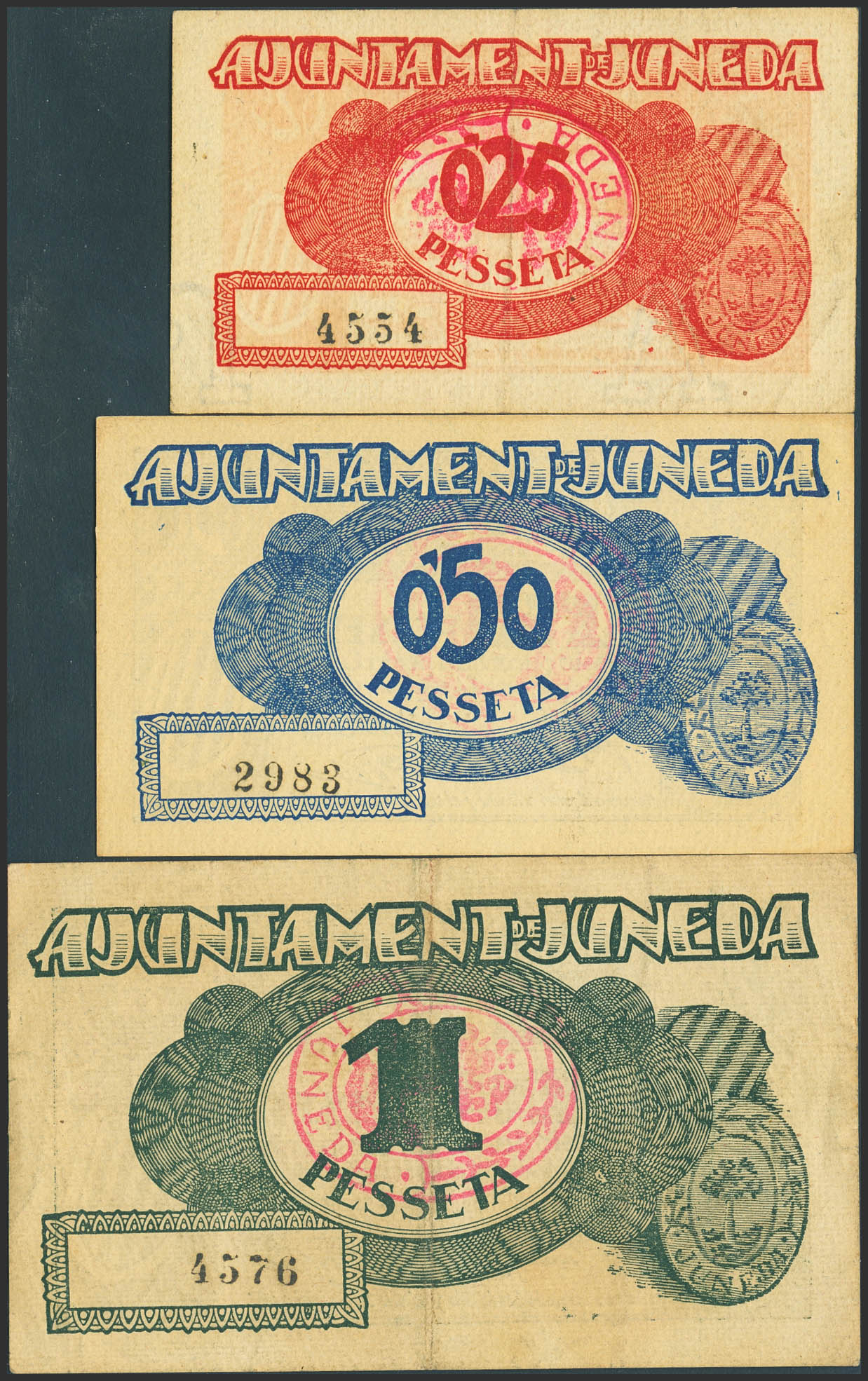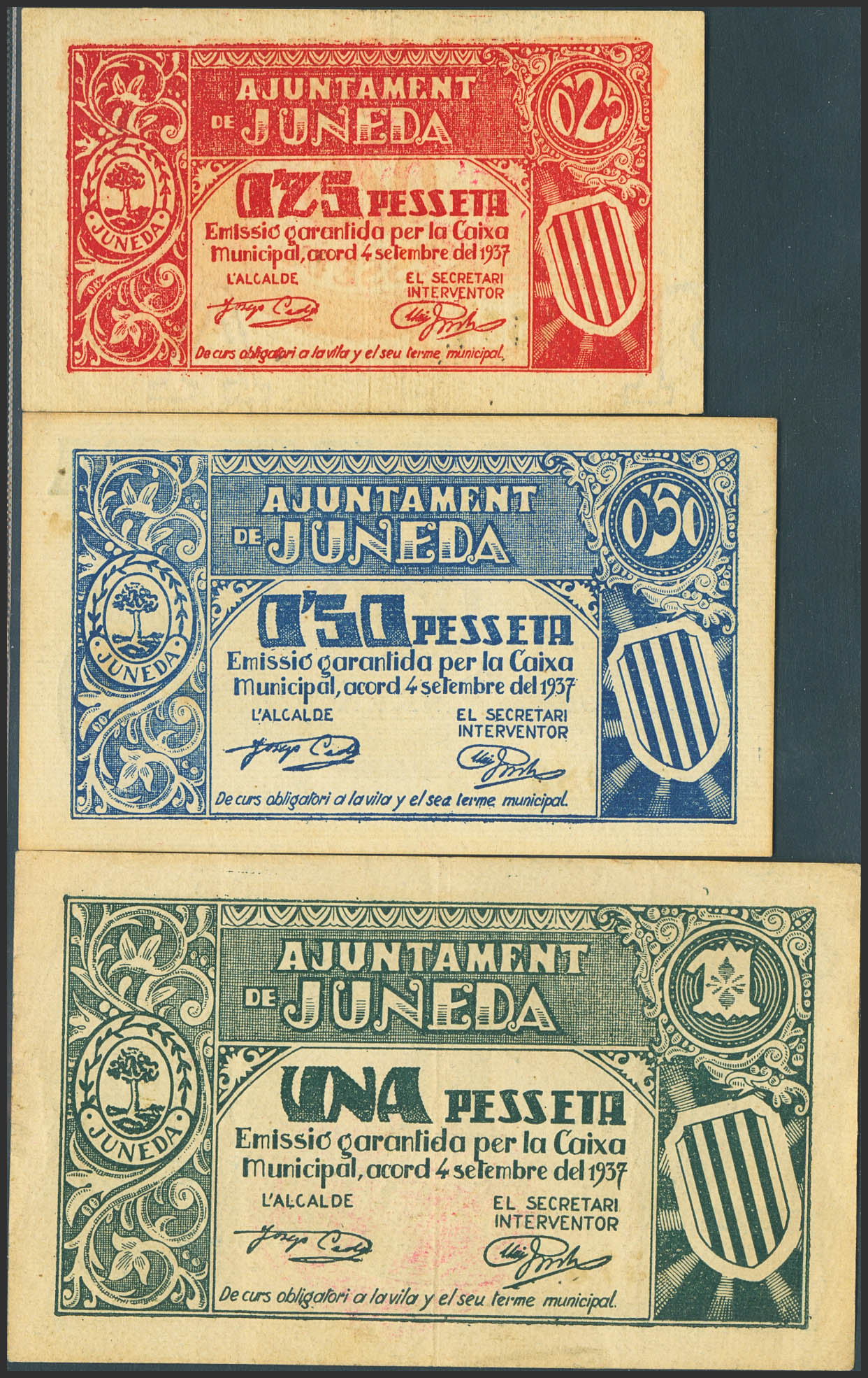 JUNEDA (LERIDA). 25 Céntimos, 50 Céntimos y 1 Peseta. 4 de Septiembre de 1937. (González: 8296/98). Inusual serie completa. MBC/SC--.