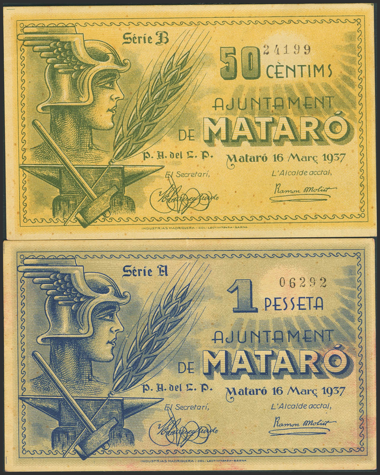 MATARO (BARCELONA). 50 Céntimos y 1 Peseta. 16 de Marzo de 1937. Serie B y A, respectivamente. (González: 8658/59). Serie completa. SC--/EBC-.