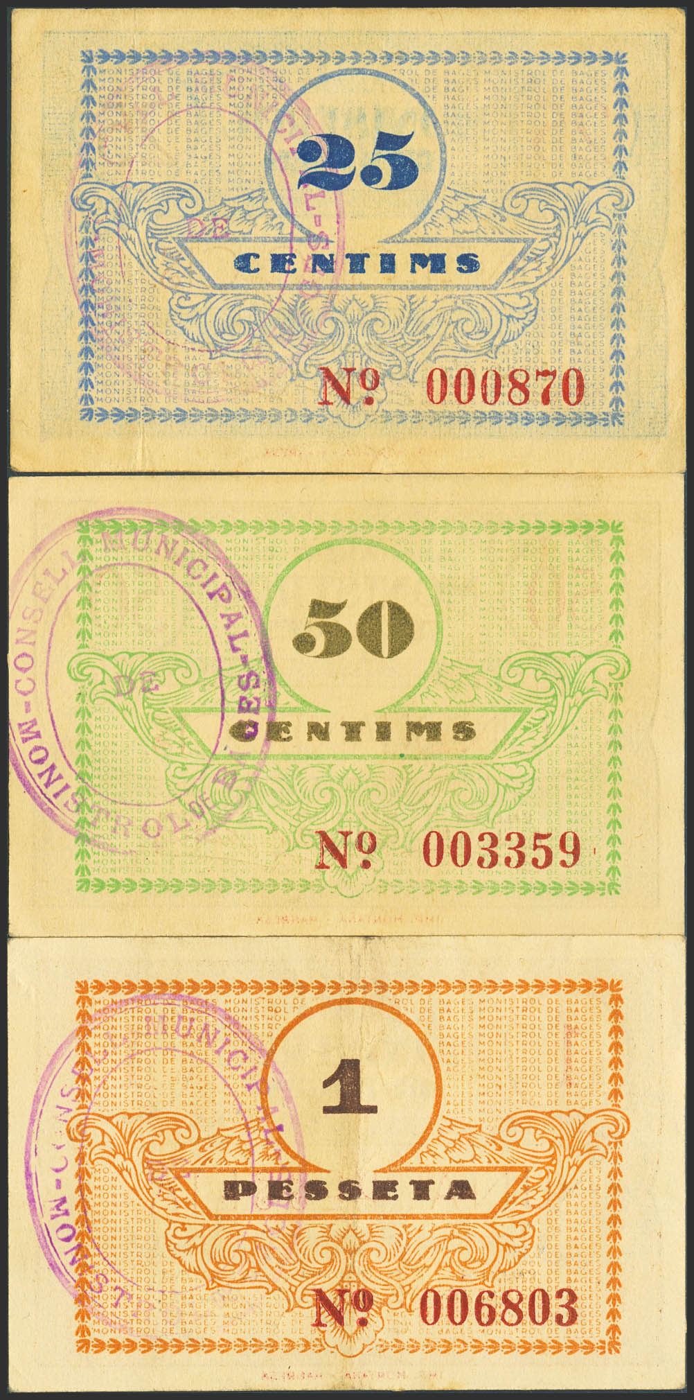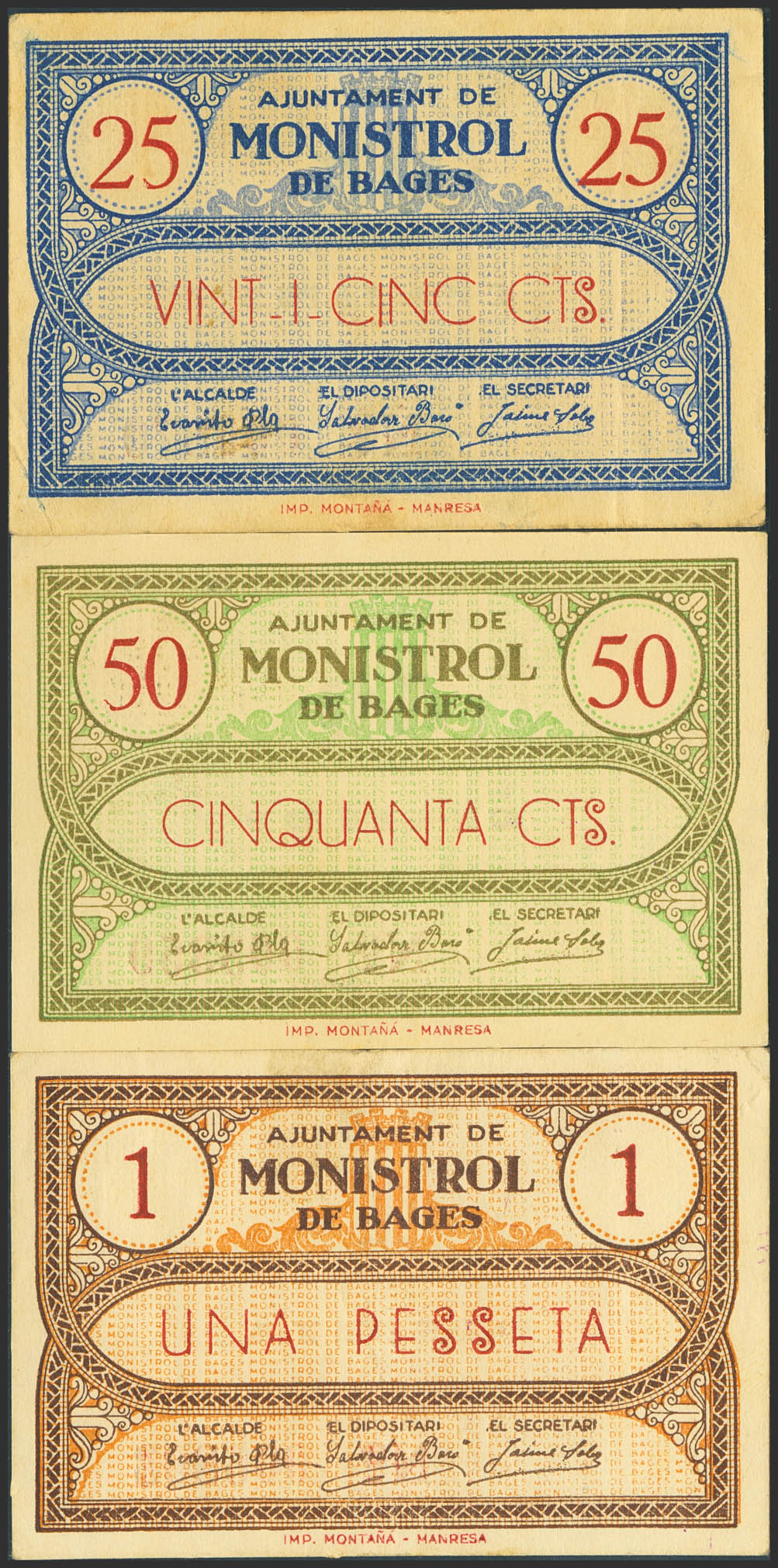 MONISTROL DE BAGES (BARCELONA). 25 Céntimos, 50 Céntimos y 1 Peseta. (1937ca). (González: 8723/25). Rara serie completa. MBC+/SC-.