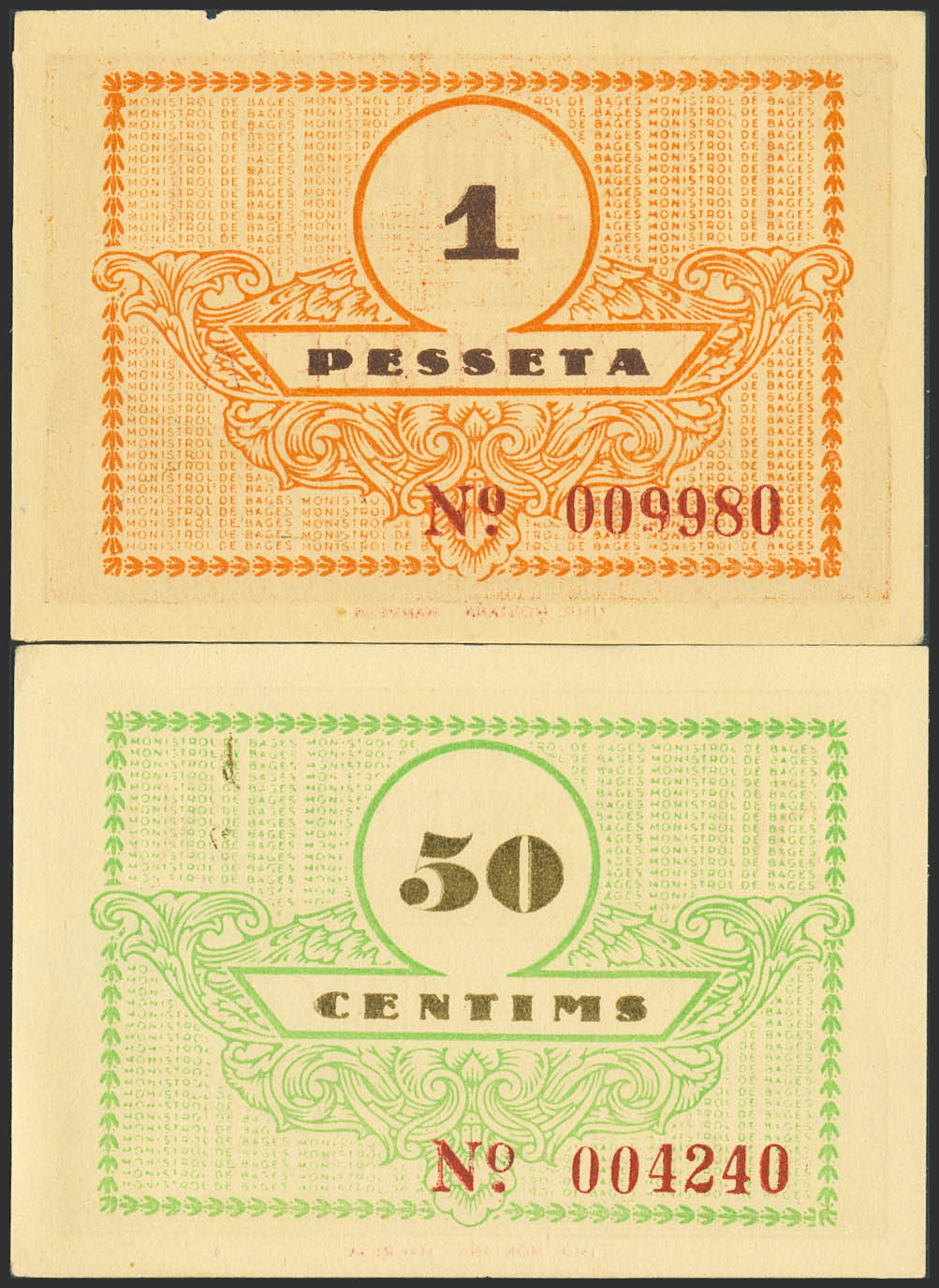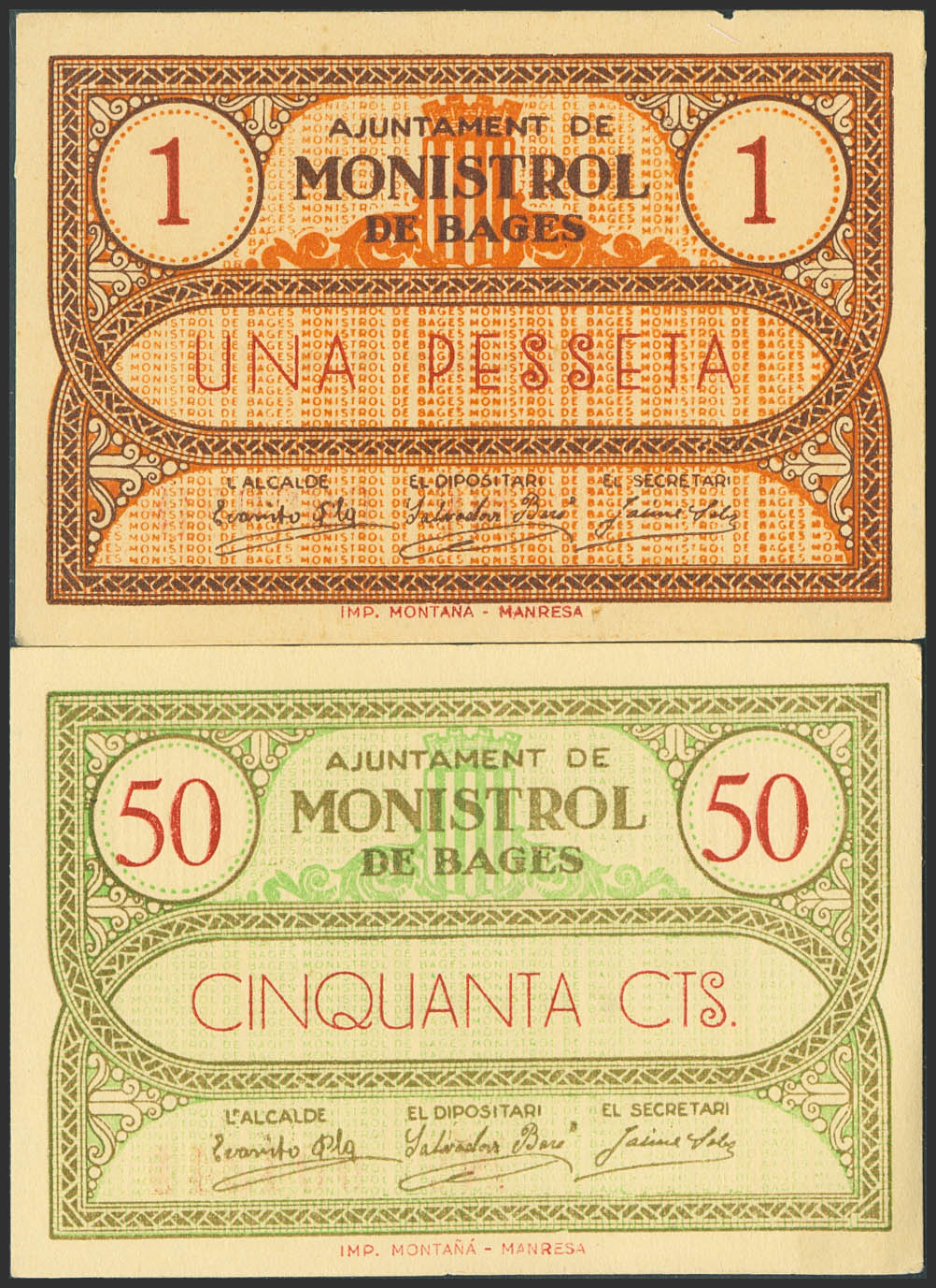 MONISTROL DE BAGES (BARCELONA). 50 Céntimos y 1 Peseta. (1937ca). (González: 8724, 8725). Raros, especialmente en esta calidad. SC-.