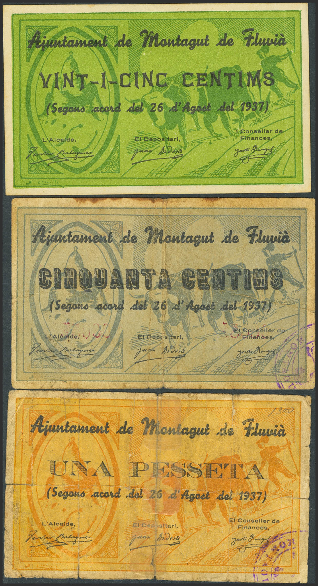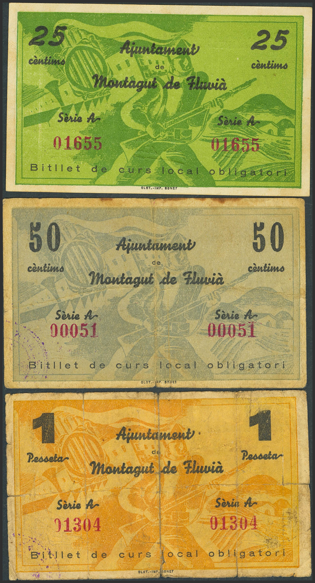 MONTAGUT DE FLUVIA (GERONA). 25 Céntimos, 50 Céntimos y 1 Peseta. 26 de Agosto de 1937. Serie A, todos. (González: 8738/40). Inusual serie completa. SC-/BC.