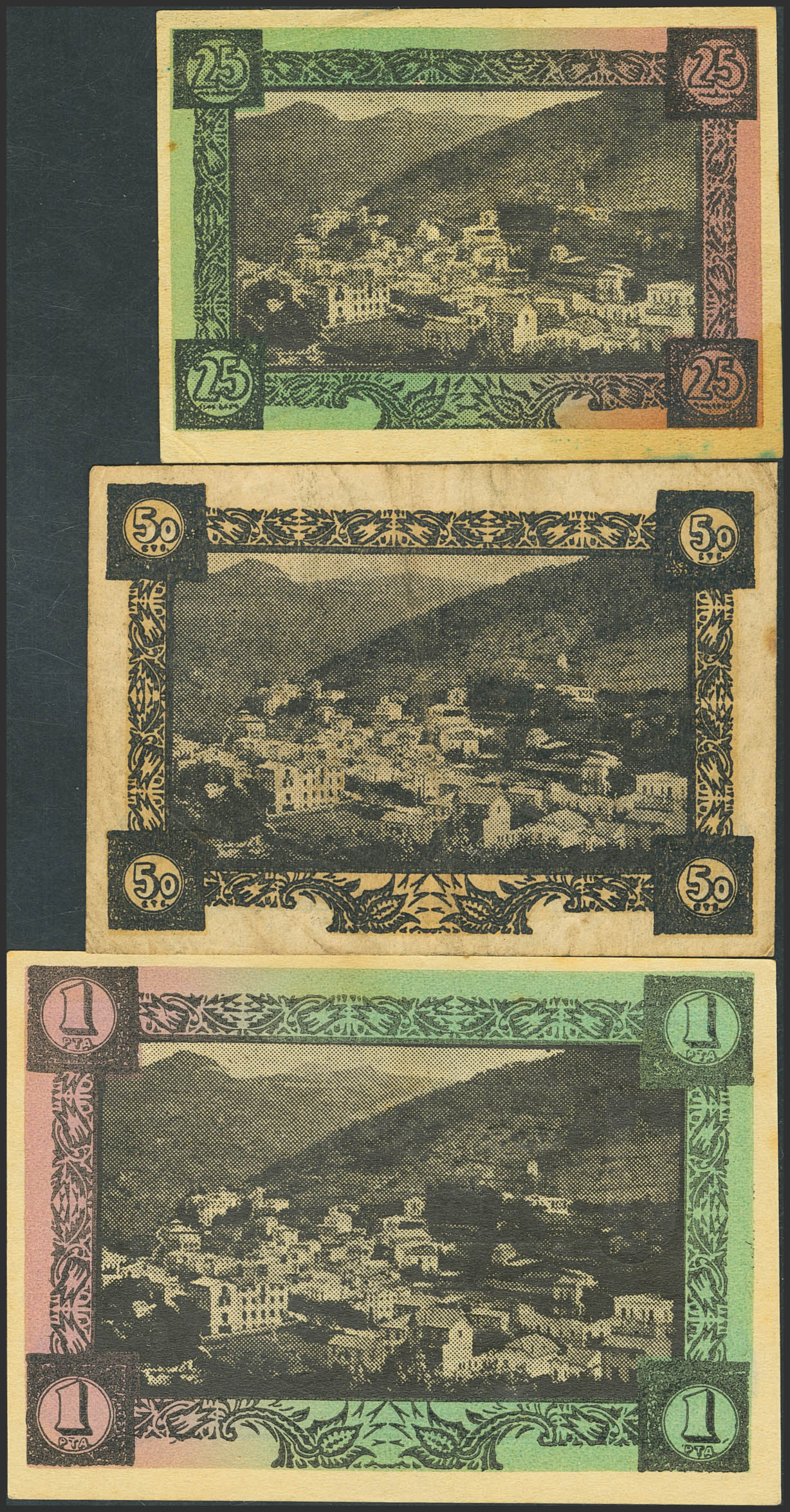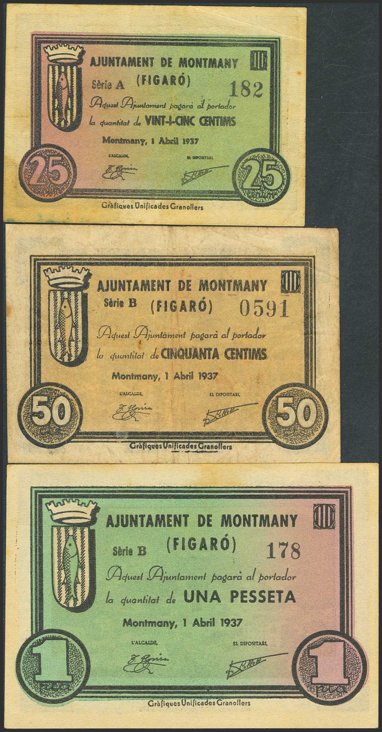 MONTMANY (BARCELONA). 25 Céntimos, 50 Céntimos y 1 Peseta. 1 de Abril de 1937. Serie A, B y B, respectivamente. (González: 8800/02). Serie completa. MBC+/SC--.