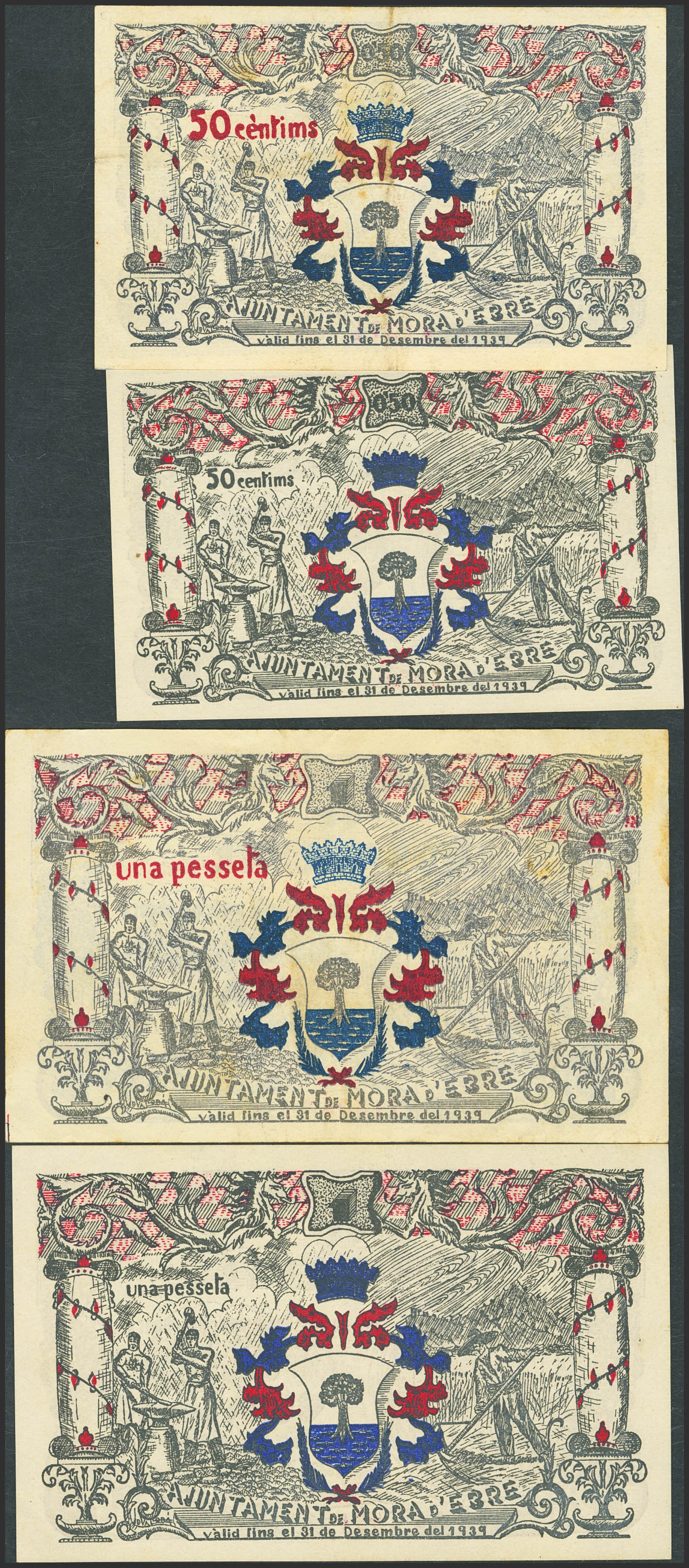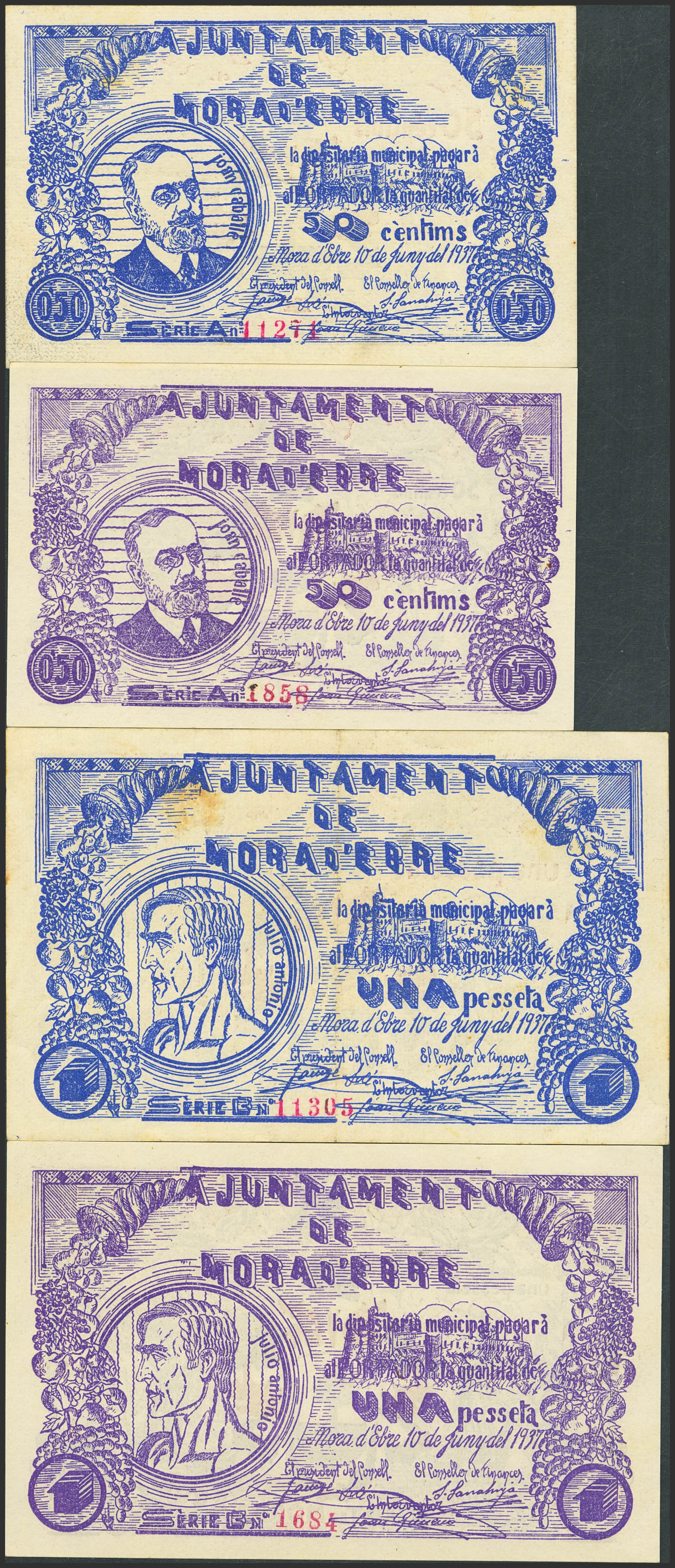 MORA DE EBRO (TARRAGONA). 50 Céntimos (violeta y azul) y 1 Peseta (violeta y azul). 10 de Junio de 1937, Serie A, A, B y B, respectivamente. (González: 8834/37). Serie completa. MBC/SC-.