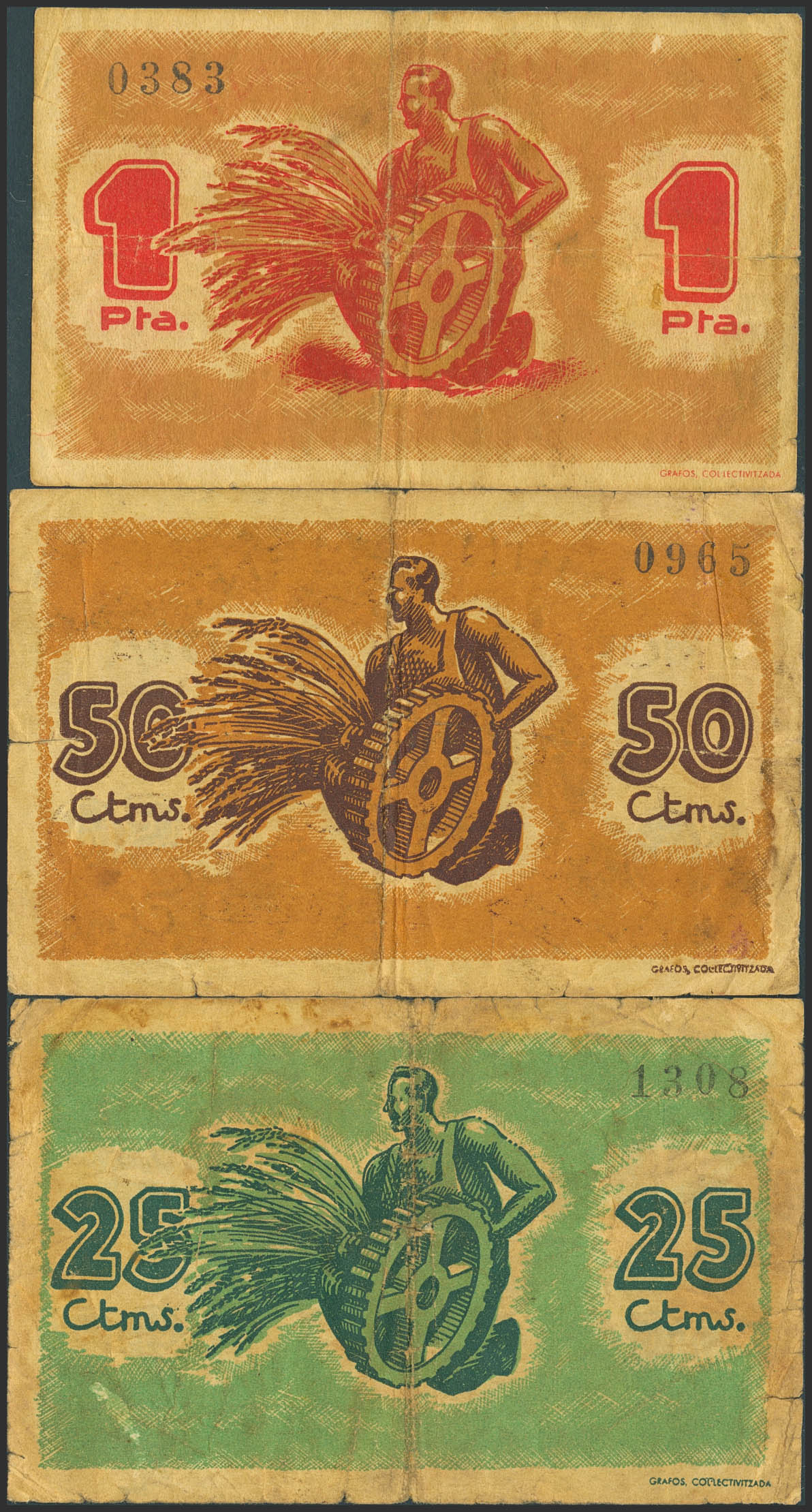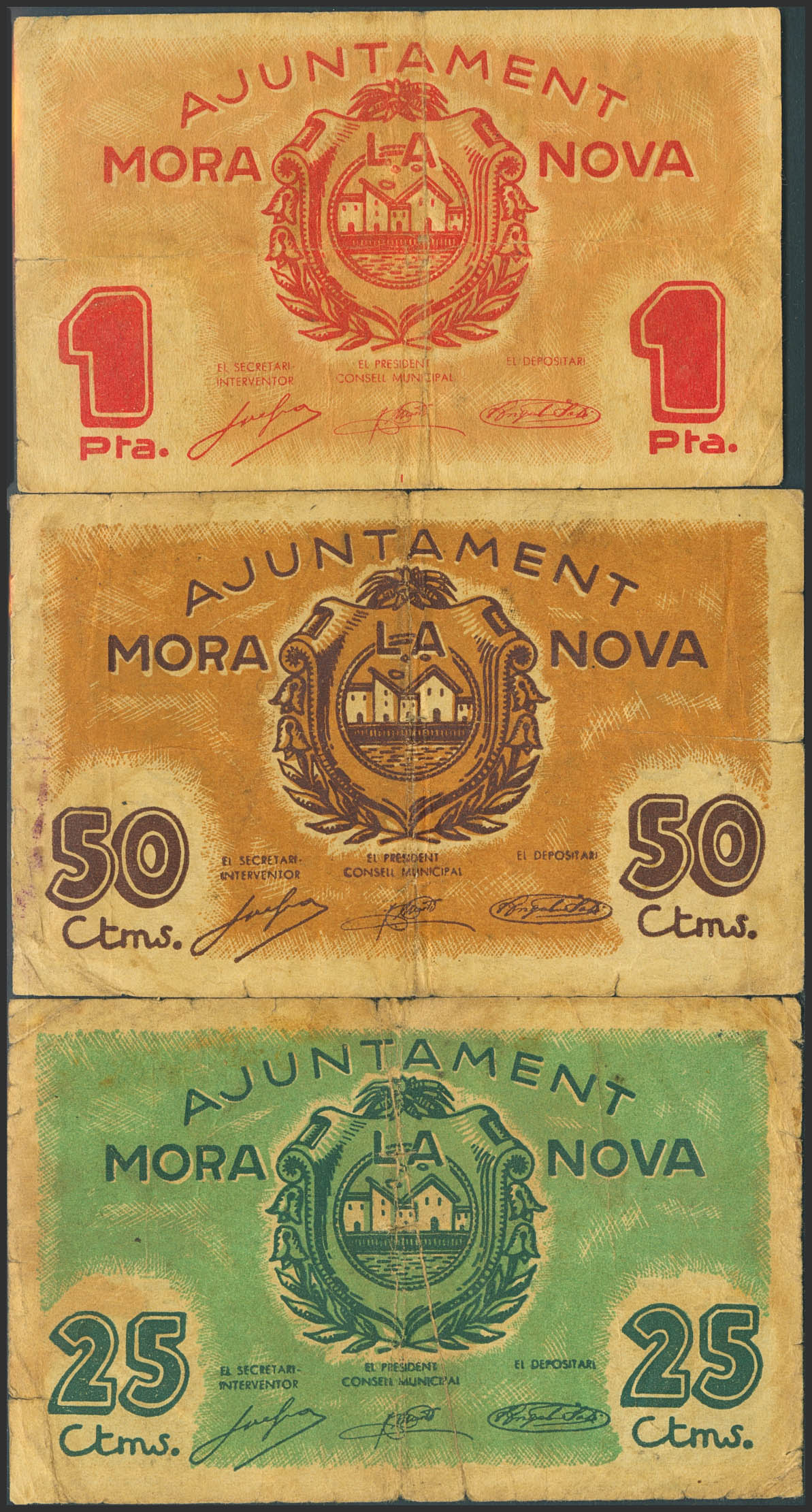 MORA LA NOVA (TARRAGONA). 25 Céntimos, 50 Céntimos y 1 Peseta. (1937ca). (González: 8847/49). Inusual serie completa. BC-.