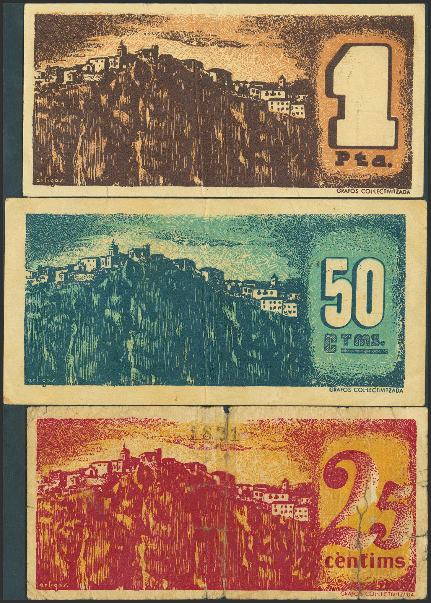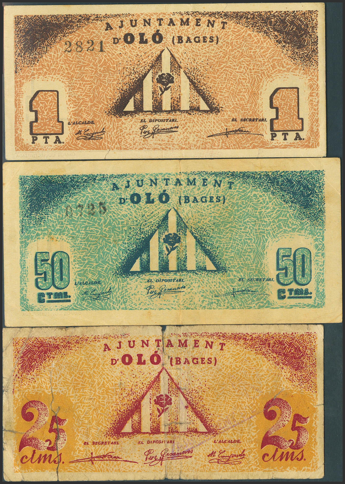 OLO (BARCELONA). 25 Céntimos, 50 Céntimos y 1 Peseta. (1937ca). (González: 8945/47). Inusual serie completa. MBC/RC+.