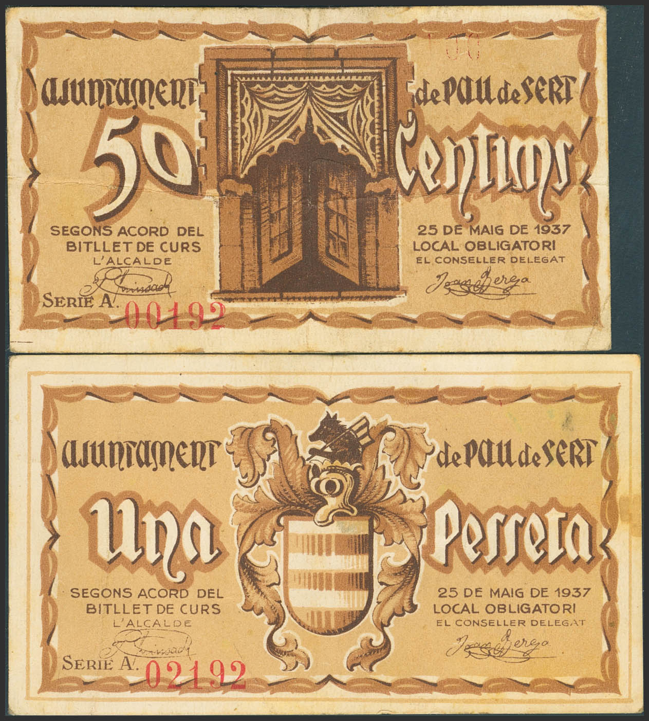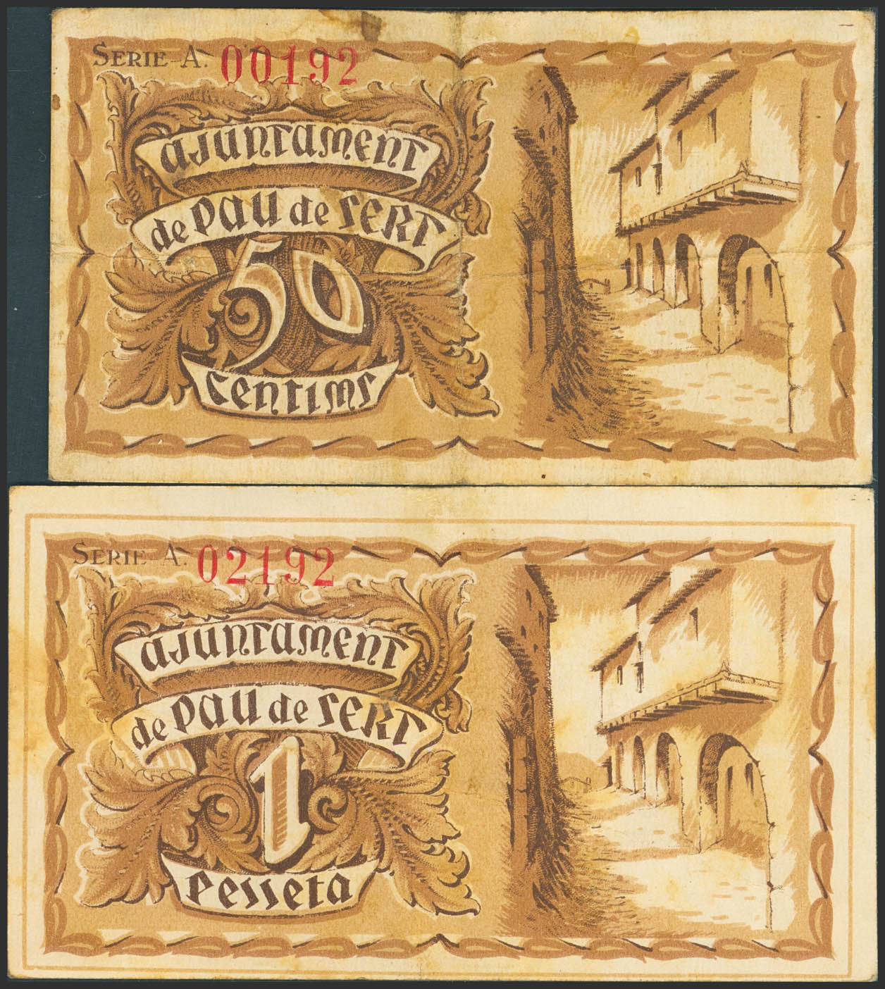 PAU DE SERT (GERONA). 50 Céntimos y 1 Peseta. 25 de Mayo de 1937. Seria A, ambos. (González: 9171/72). Inusual serie completa. MBC.