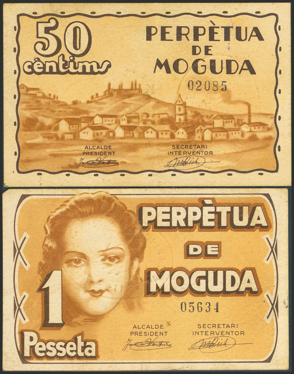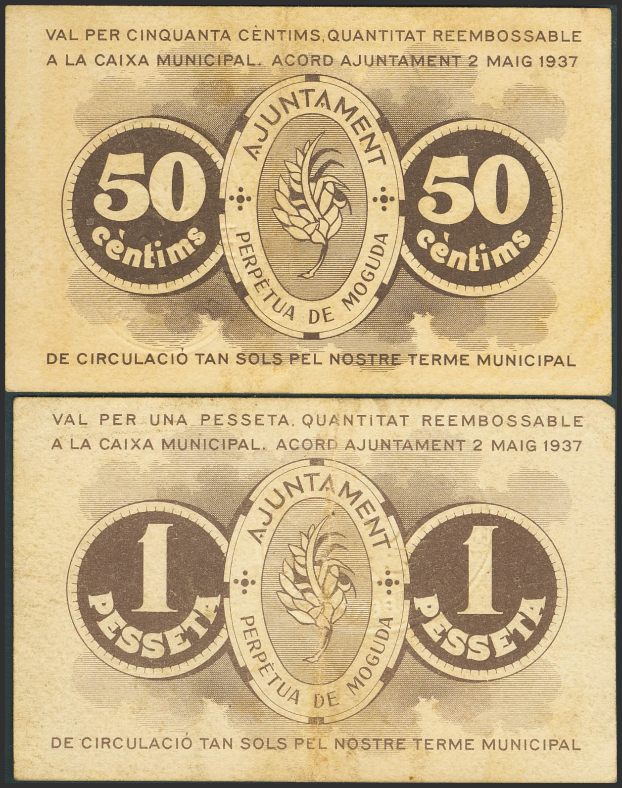 PERPETUA DE MOGUDA (BARCELONA). 50 Céntimos y 1 Peseta. 2 de Mayo de 1937. (González: 9205/06). Serie completa. EBC-/EBC.