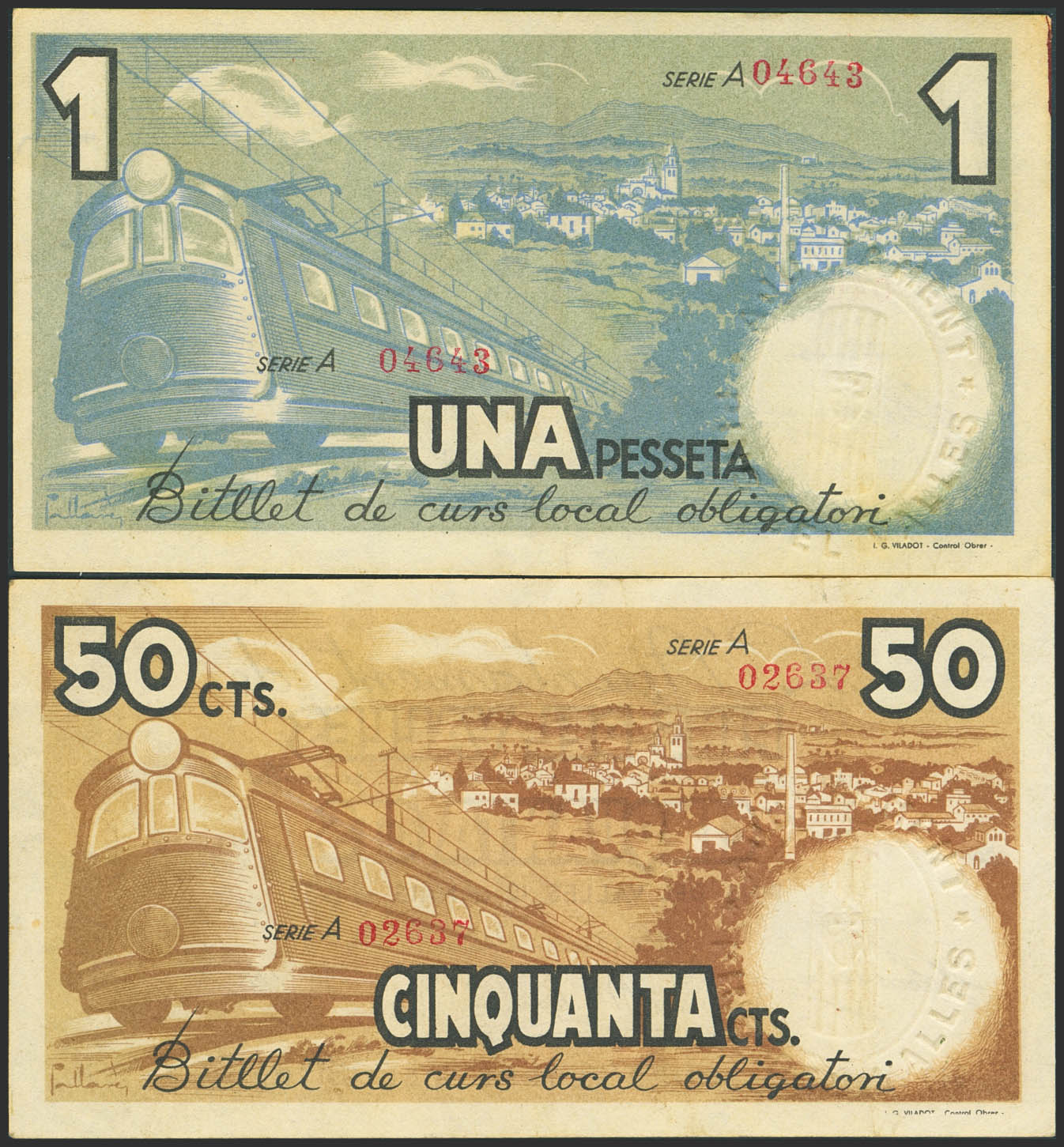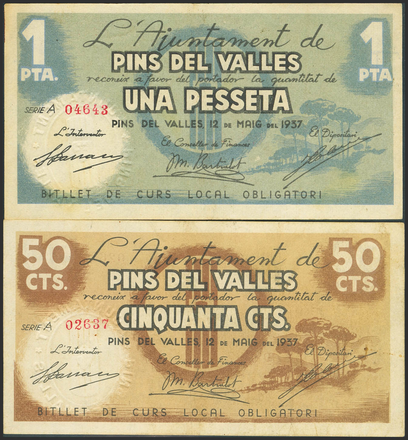 PINS DEL VALLES (BARCELONA). 50 Céntimos y 1 Peseta. 12 de Mayo de 1937. Serie A, ambos. (González: 9244/45). Serie completa. MBC+.