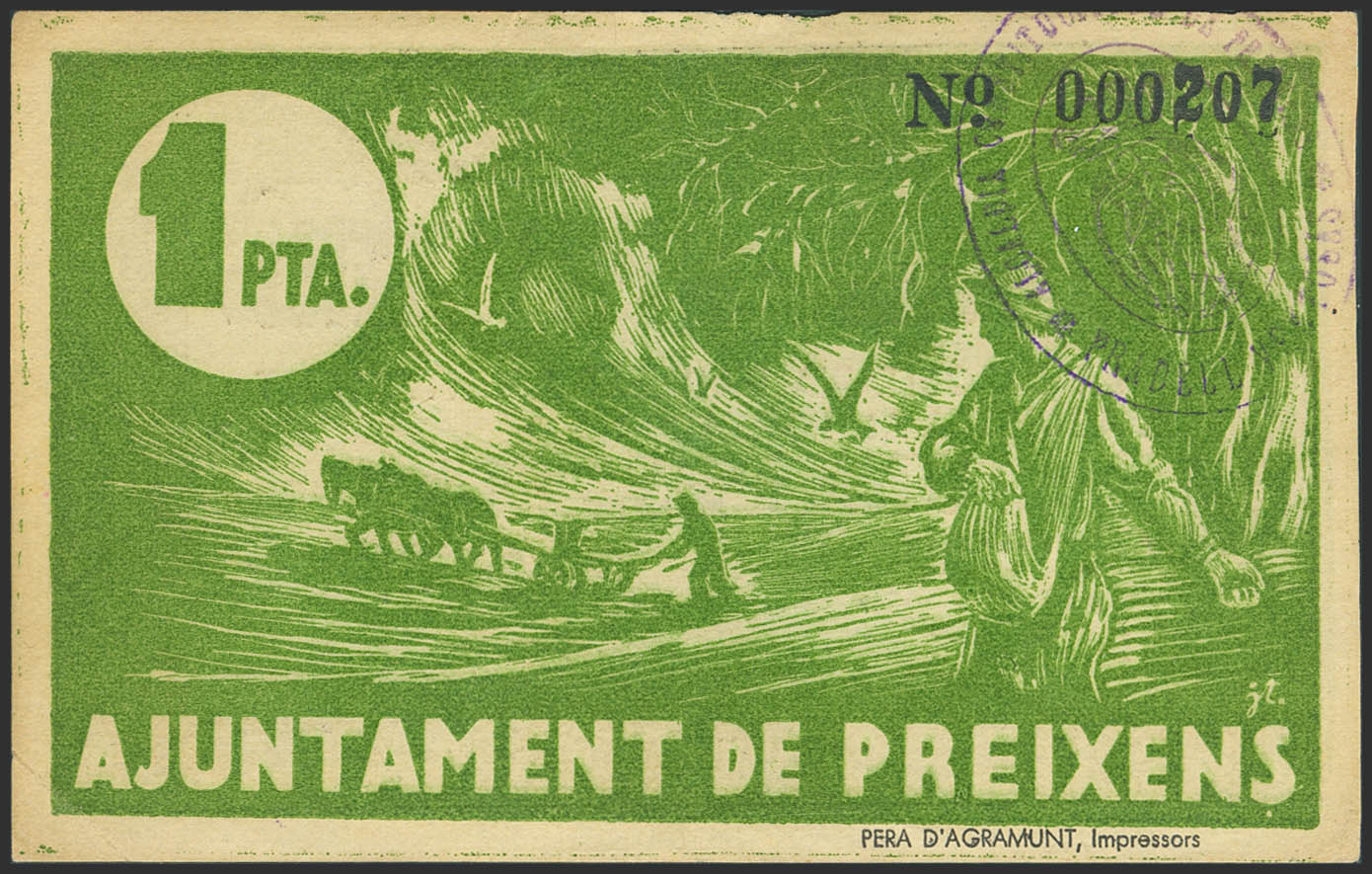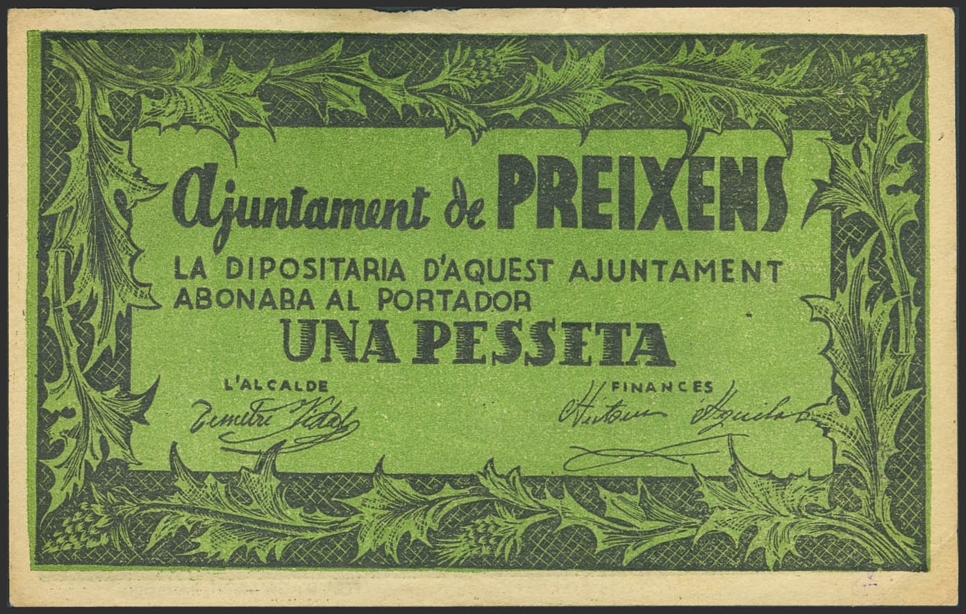PREIXENTS (LERIDA). 1 Peseta. (1937ca). (González: 9450). Muy raro. MBC-.