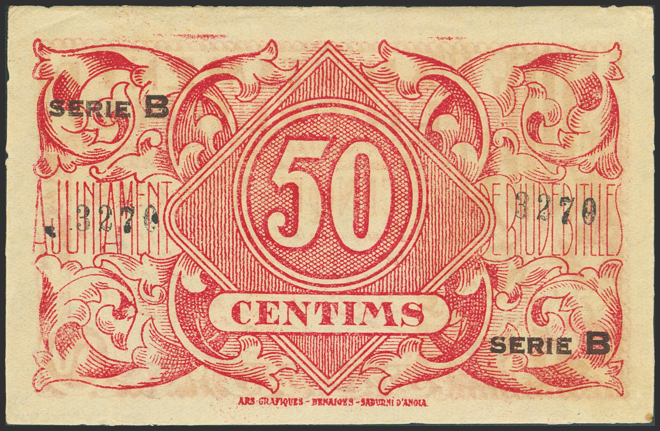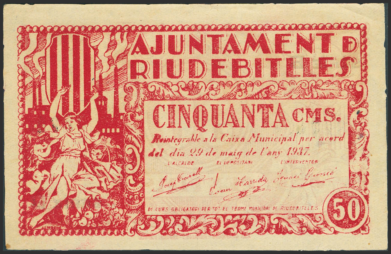 RIUDEBITLLES (BARCELONA). 50 Céntimos. 29 de Mayo de 1937. Serie B. (González: 9679). Raro. SC--.