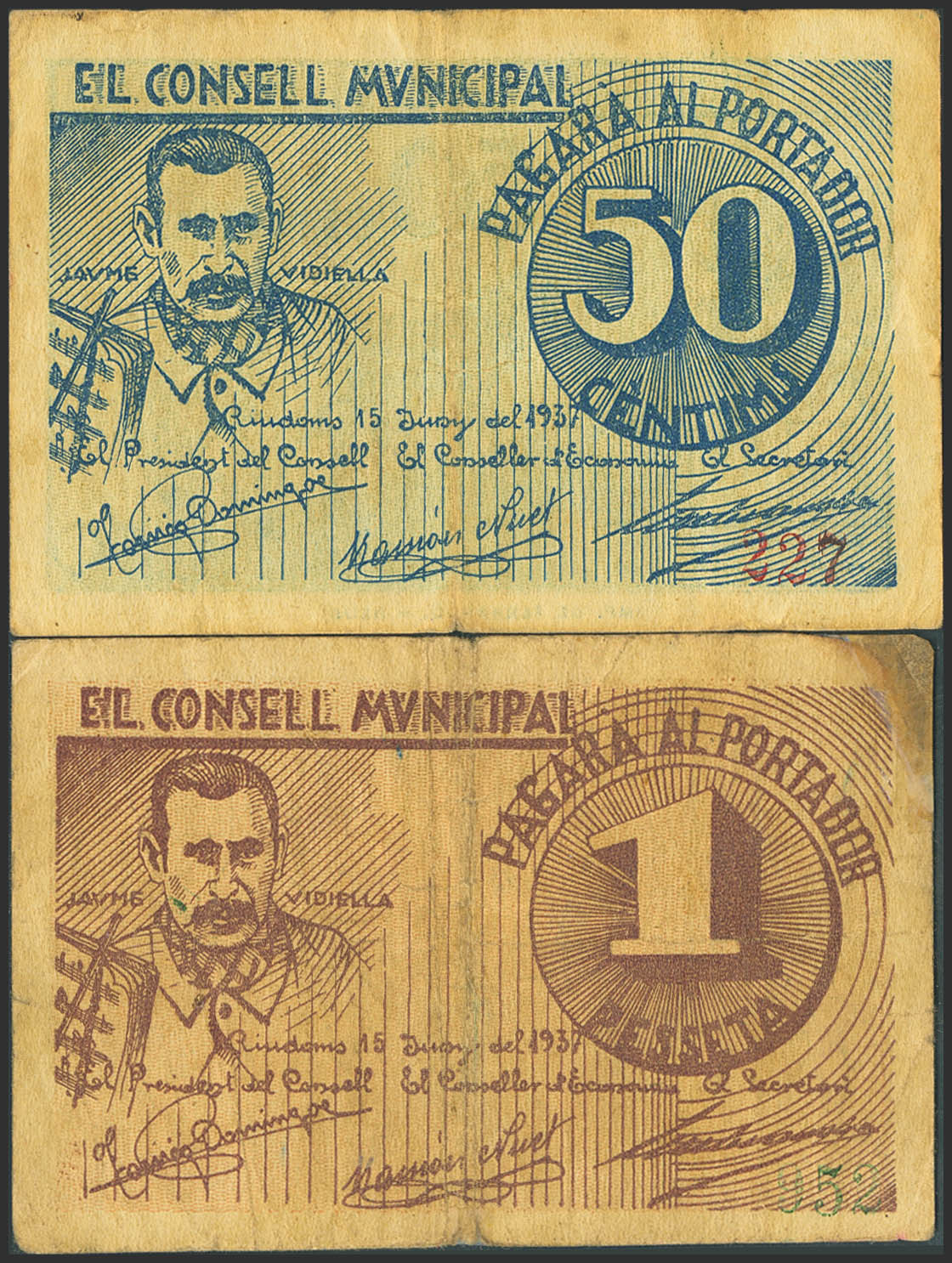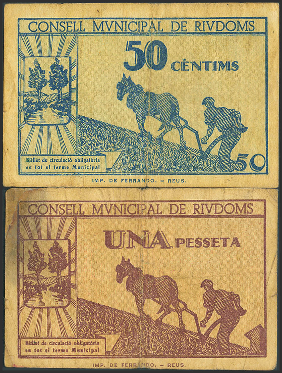 RIUDOMS (TARRAGONA). 50 Céntimos y 1 Peseta. 15 de Junio de 1937. (González: 9696/97). Rara serie completa. BC-.
