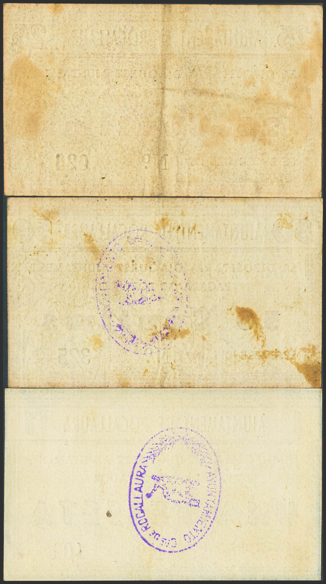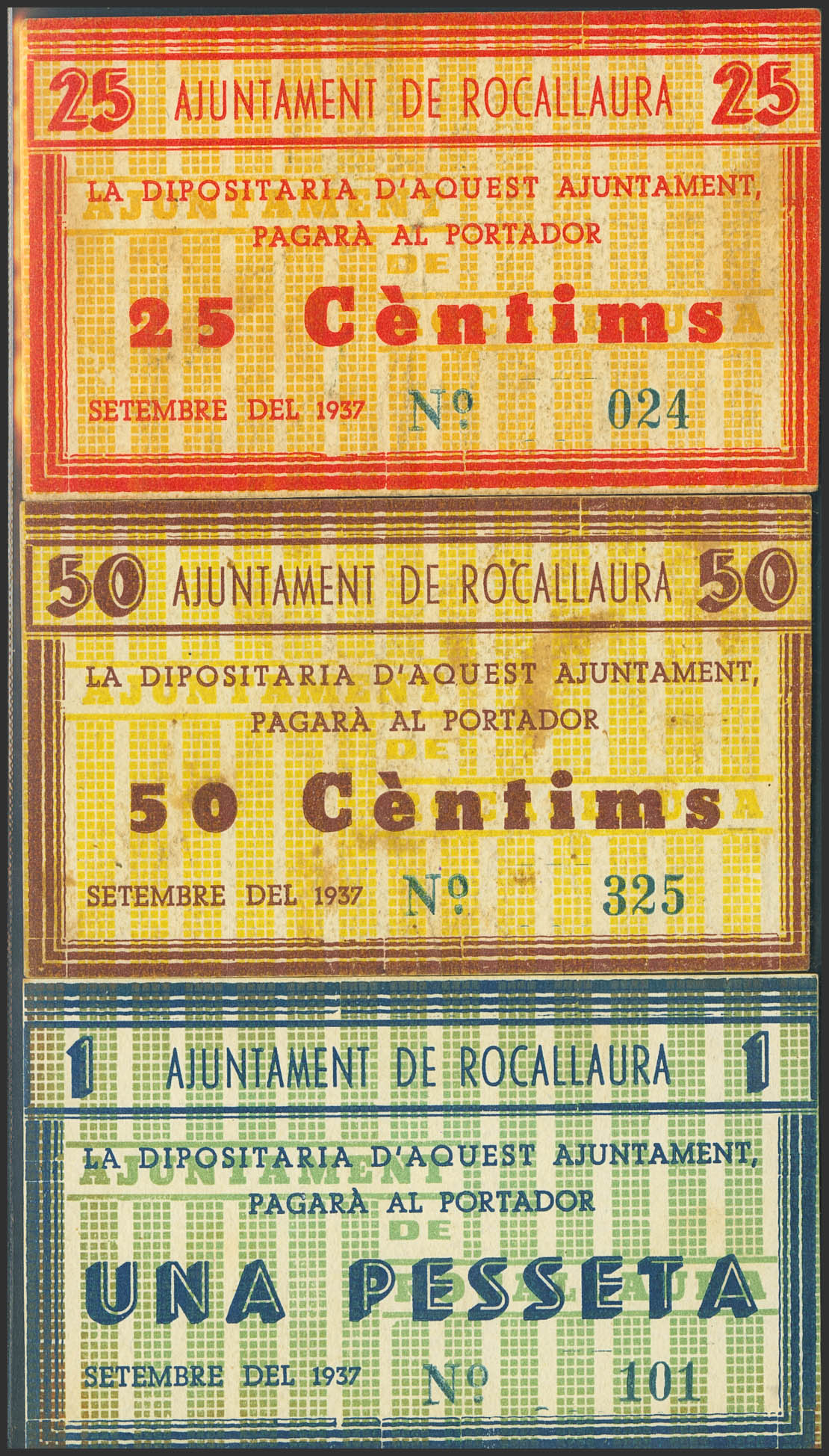 ROCALLAURA (LERIDA). 25 Céntimos, 50 Céntimos y 1 Peseta. Septiembre de 1937. (González: 9711/13). Rara serie completa. MBC/SC-.