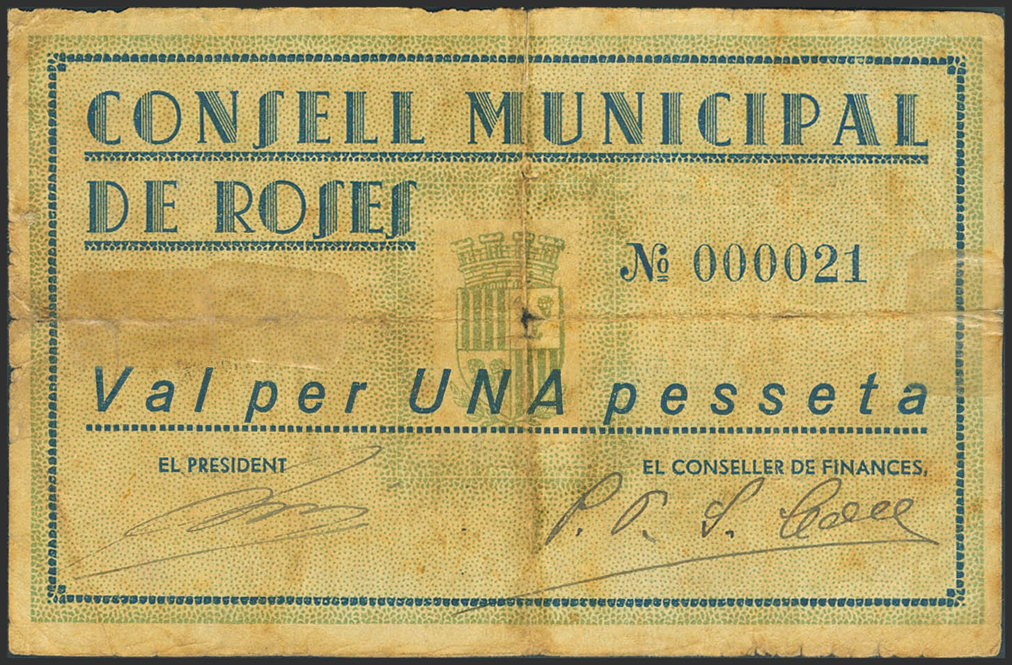 ROSES (GERONA). 1 Peseta. (1937ca). (González: 9746). Raro. BC.