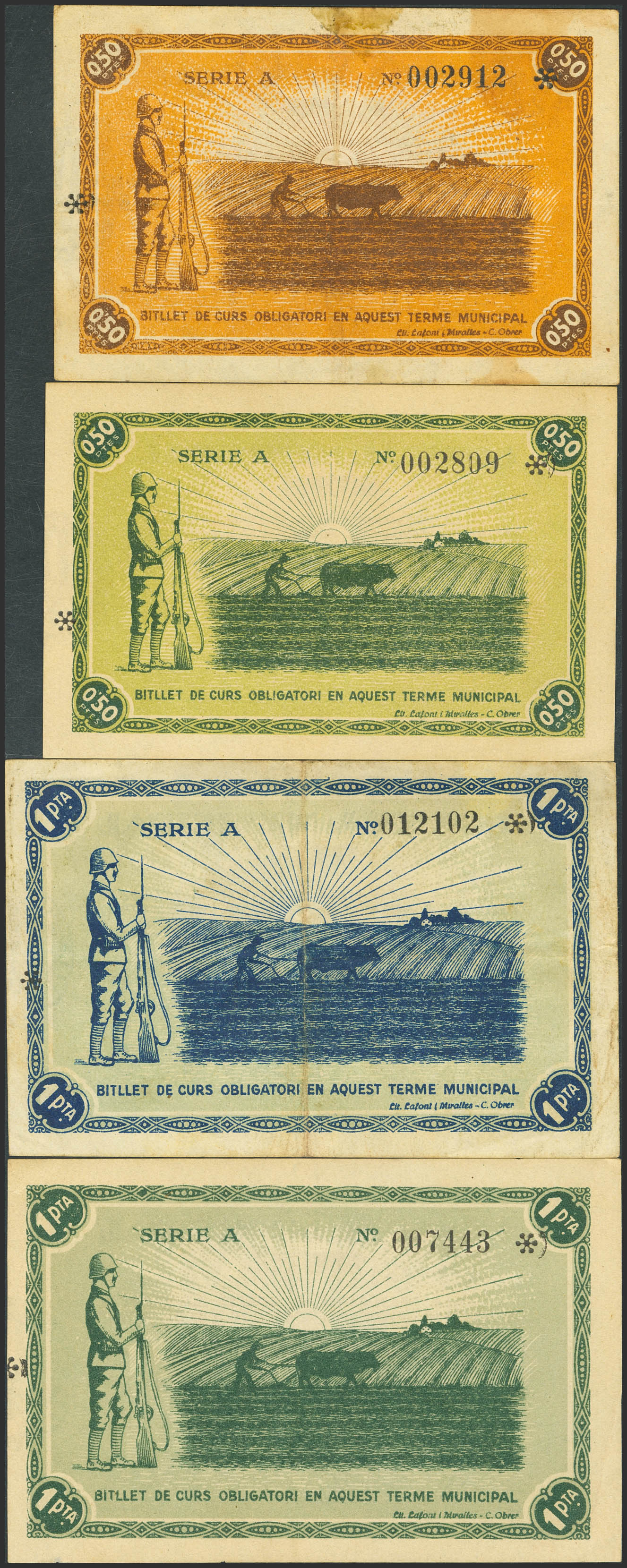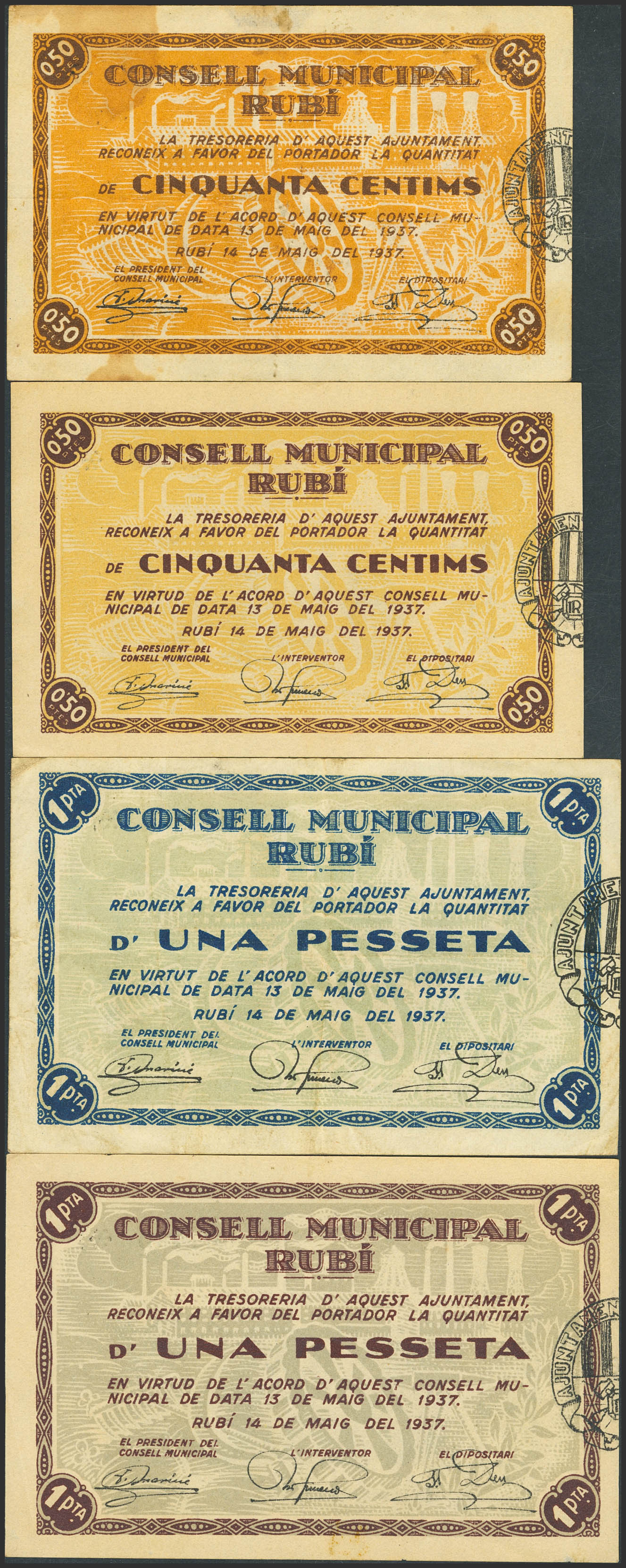 RUBI (BARCELONA). 50 Céntimos (2) y 1 Peseta (2). 13 de Mayo de 1937. Serie A, todos. (González: 9759/62). Serie completa. MBC/SC-.