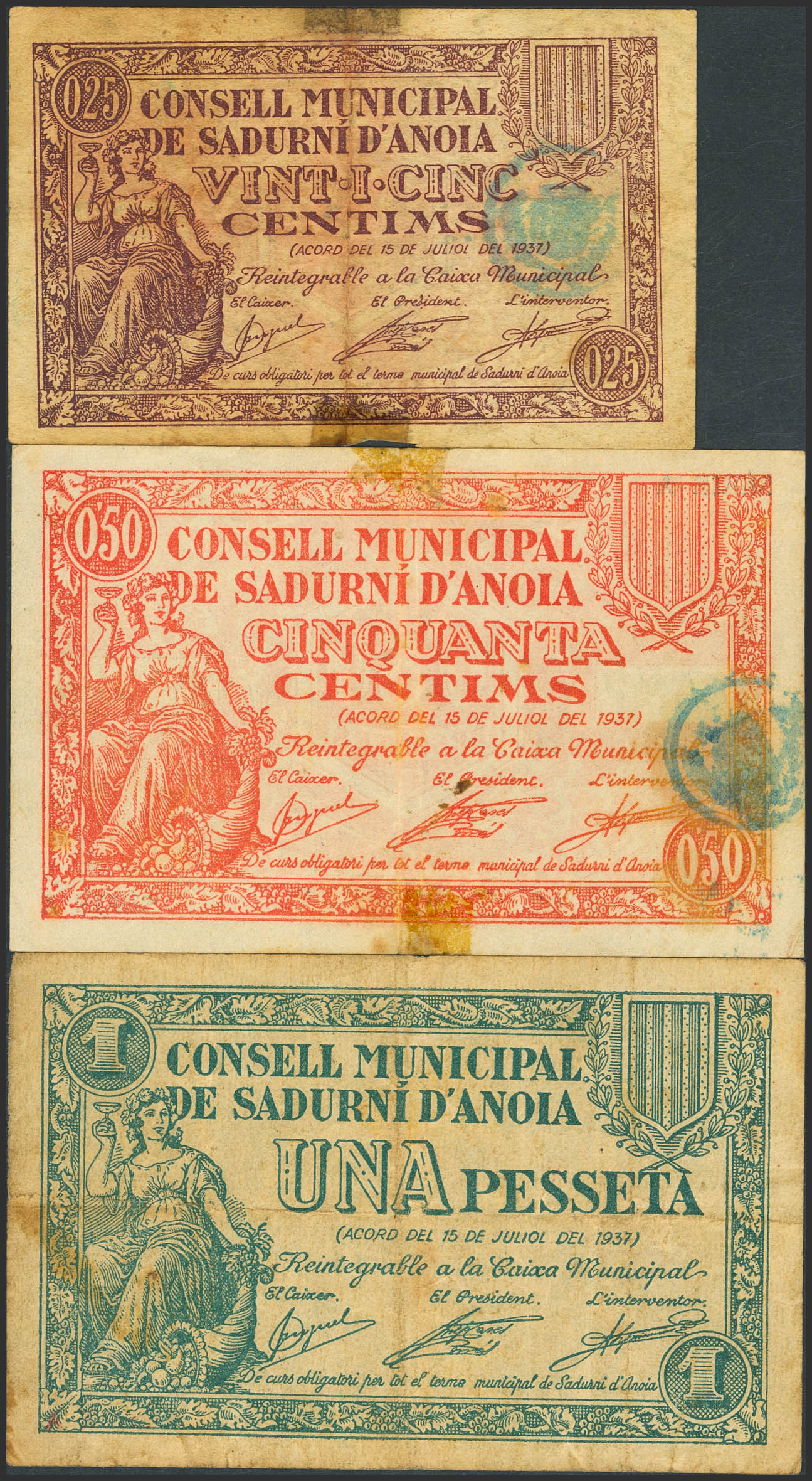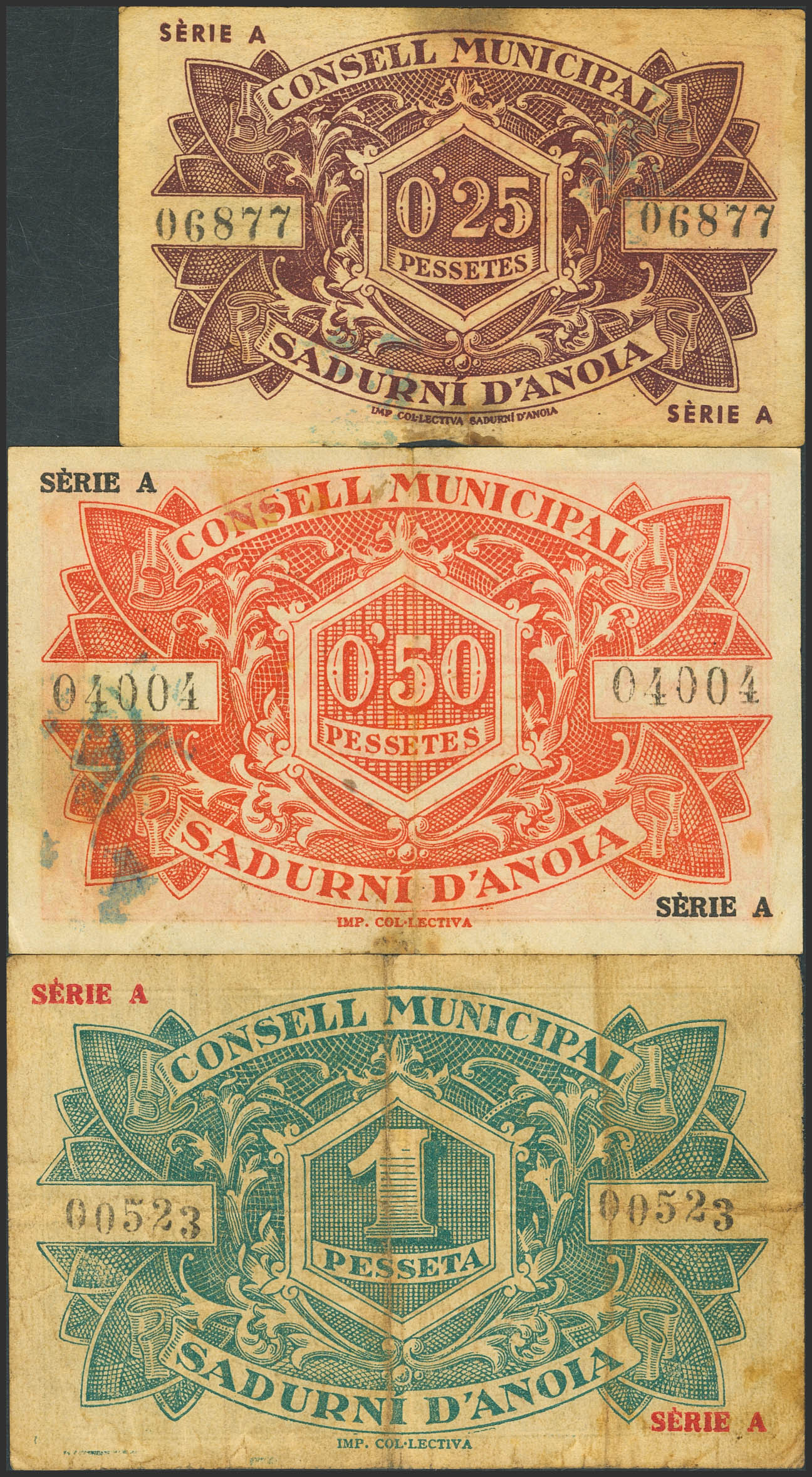 SADURNI DE ANOIA (BARCELONA). 25 Céntimos, 50 Céntimos y 1 Peseta. 15 de Julio de 1937. Serie A, todos. (González: 9804/06). Serie completa. MBC-.