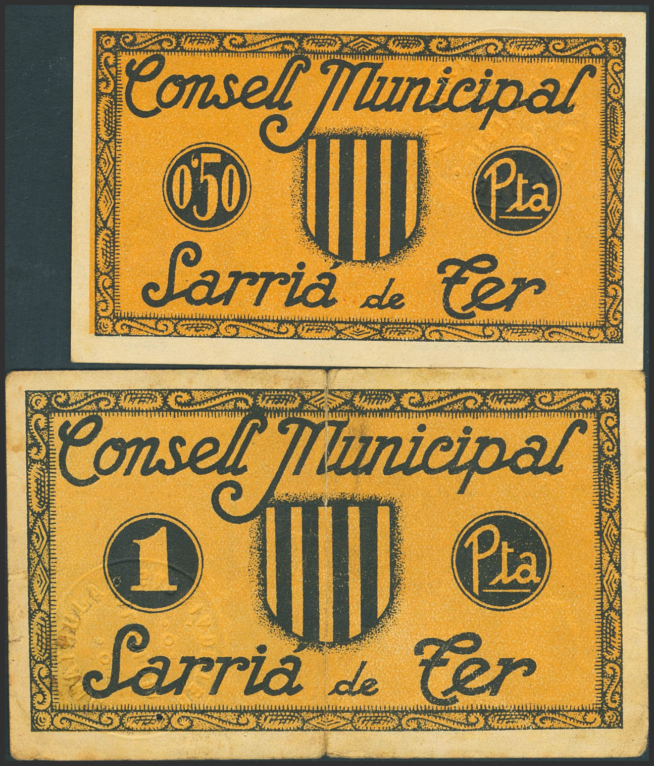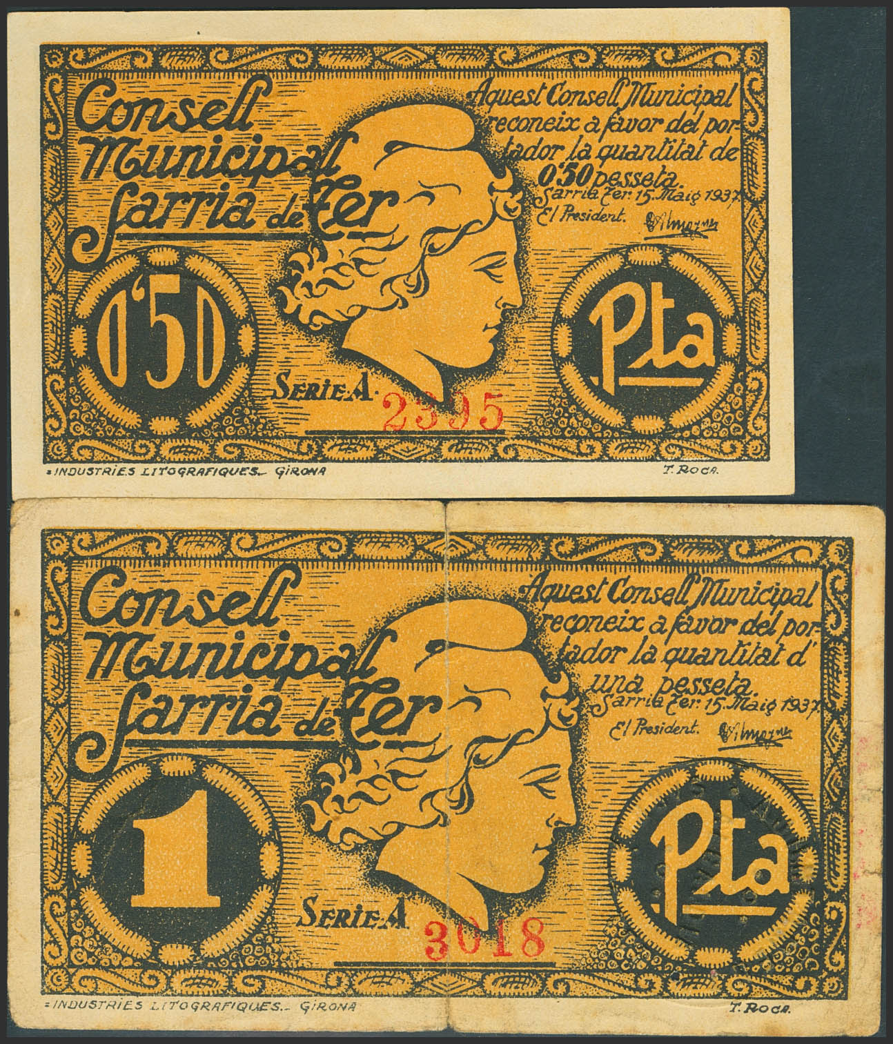 SARRIA DE TER (GERONA). 50 Céntimos y 1 Peseta. 15 de Mayo de 1937. Serie A, todos. (González: 9883/84). Inusual serie completa. SC-/RC-.