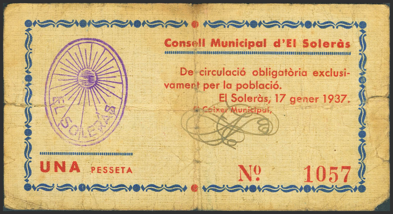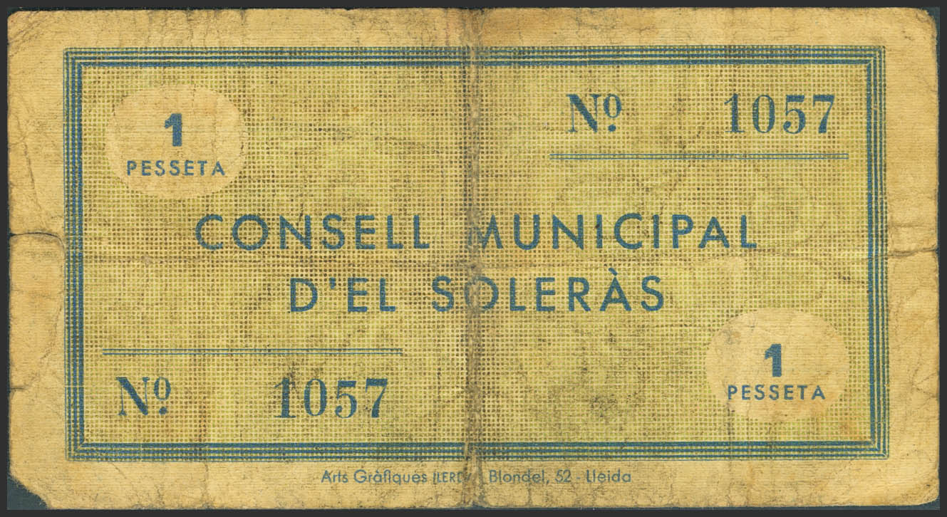 SOLERAS (LERIDA). 1 Peseta. 17 de Enero de 1937. (González: 10020). Muy raro. BC-.