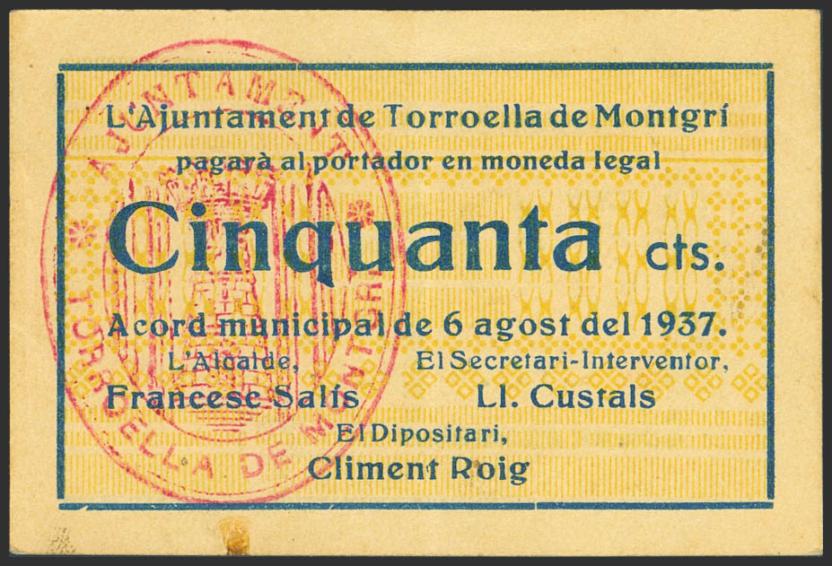 TORROELLA DE MONTGRI (GERONA). 50 Céntimos. 6 de Agosto de 1937. (González: 10394). Inusual. EBC-.