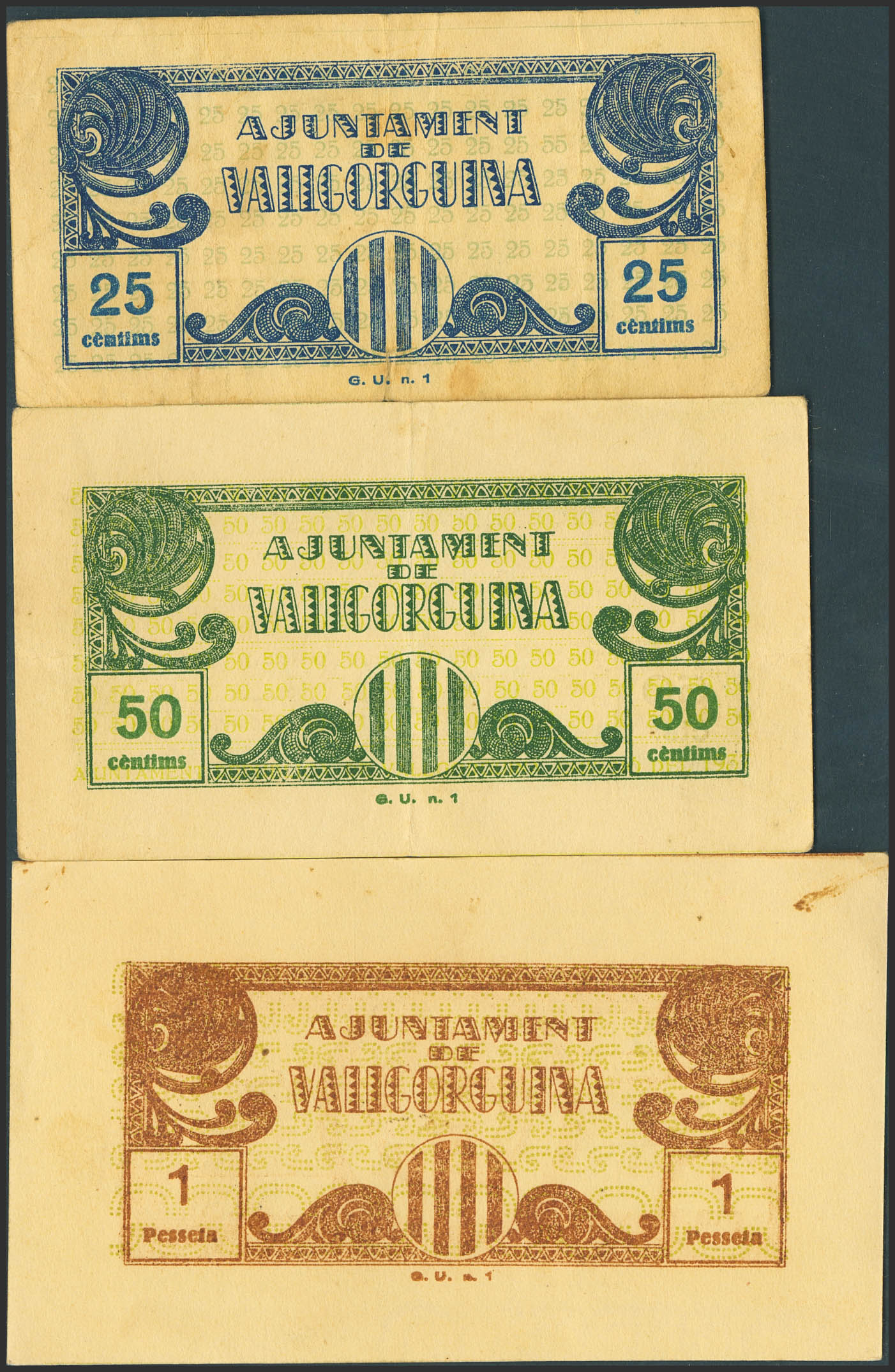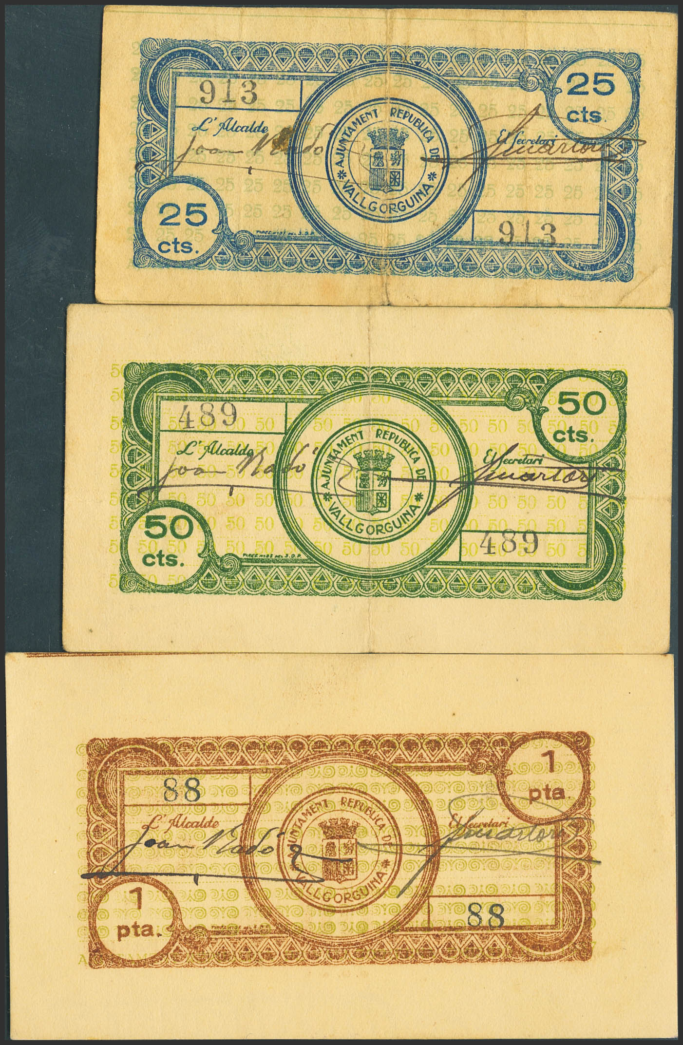 VALLGORGUINA (BARCELONA). 25 Céntimos, 50 Céntimos y 1 Peseta. (1937ca). (González: 10527/29). Rara serie completa. SC--/MBC-.