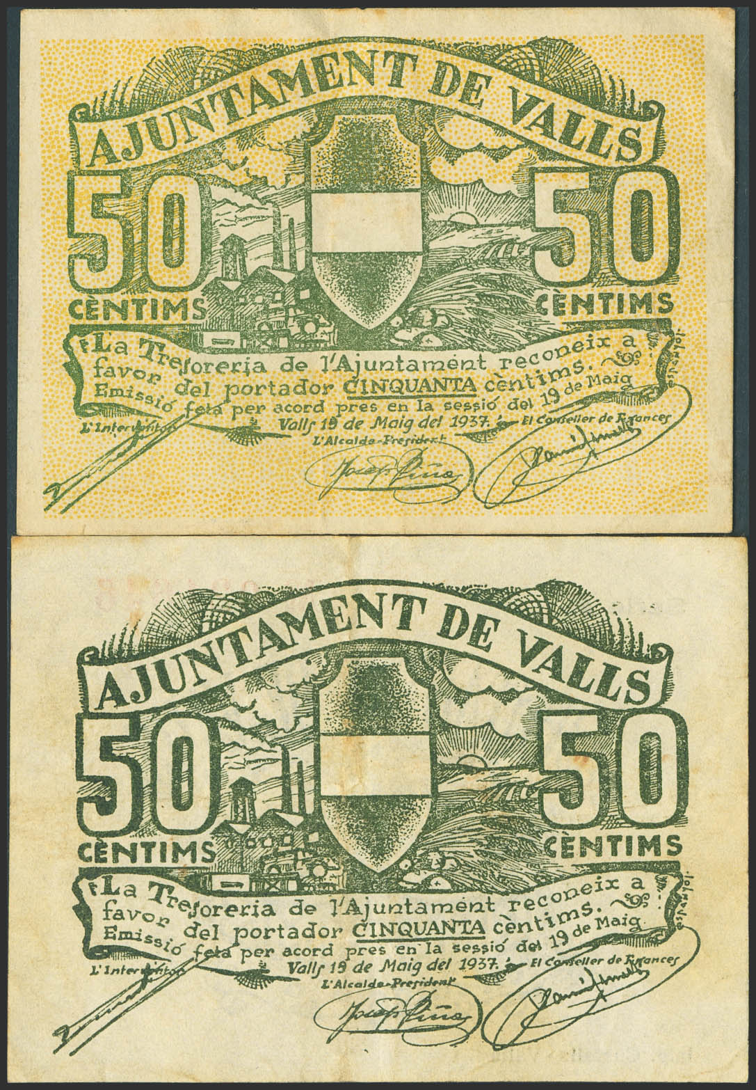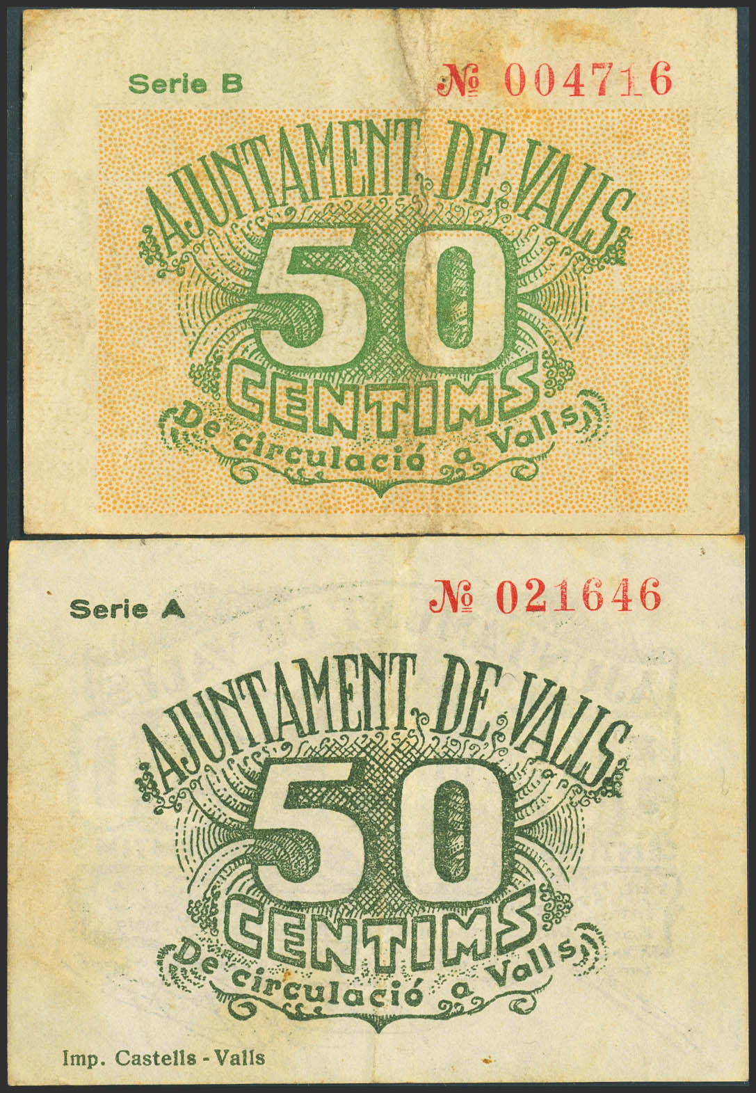 VALLS (TARRAGONA). 50 Céntimos (2). 19 de Mayo de 1937. Serie A y B, respectivamente. (González: 10543/44). Inusual serie completa. MBC.