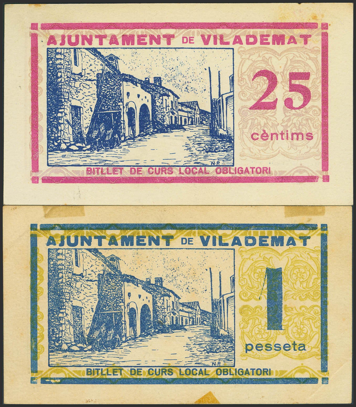 VILDEMAT (GERONA). 25 Céntimos y 1 Peseta. (1937ca). Serie A, ambos. (González: 10698/99). Inusual serie completa, especialmente en esta calidad. SC--.