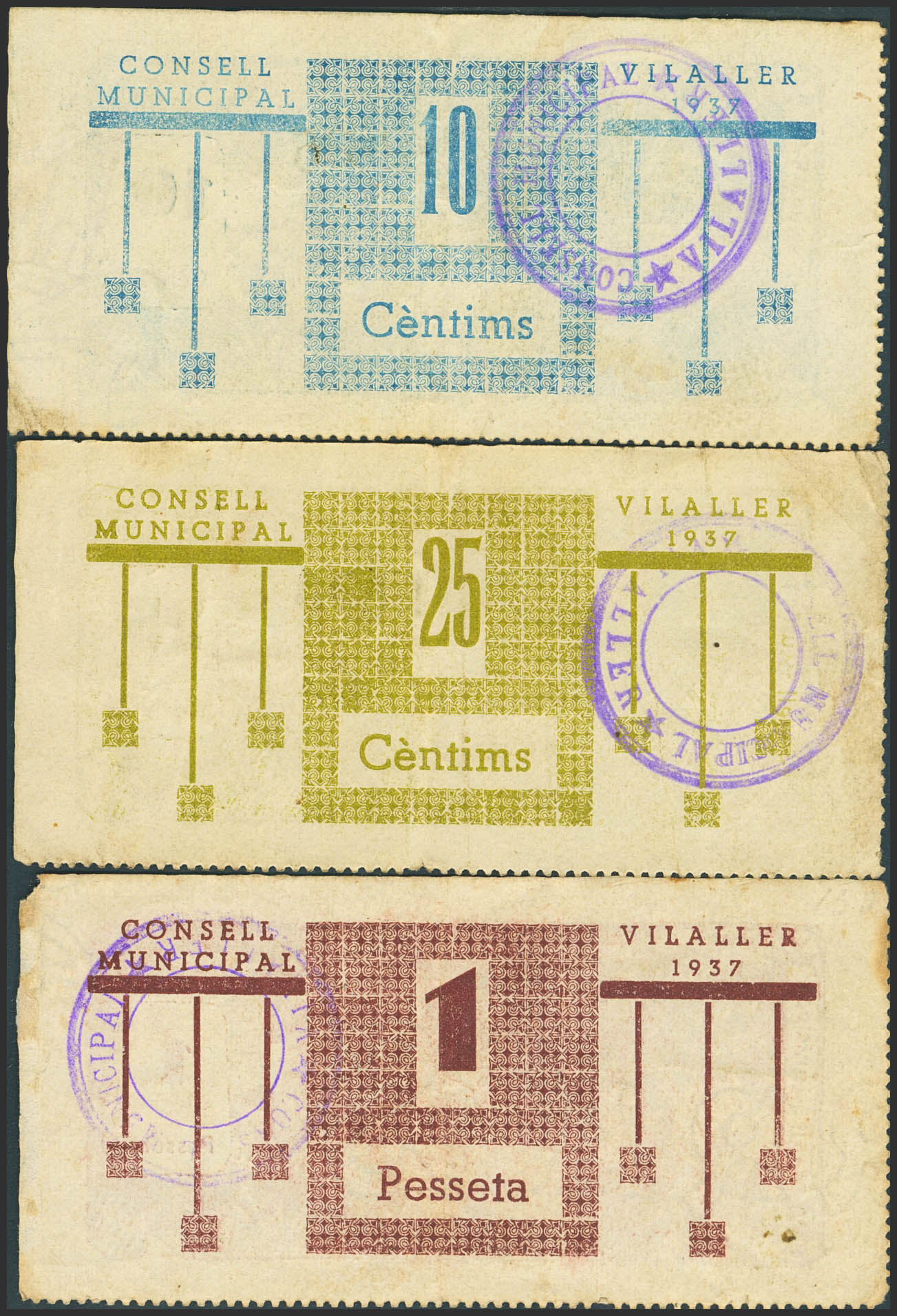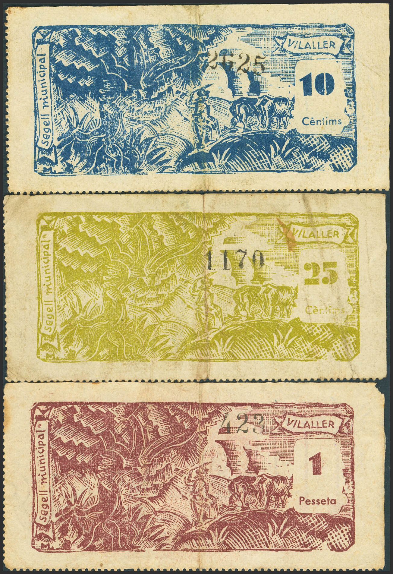 VILALLER (LERIDA). 10 Céntimos, 25 Céntimos y 1 Peseta. 1937. (González: 10750/52). Rara serie completa. MBC-/MBC+.