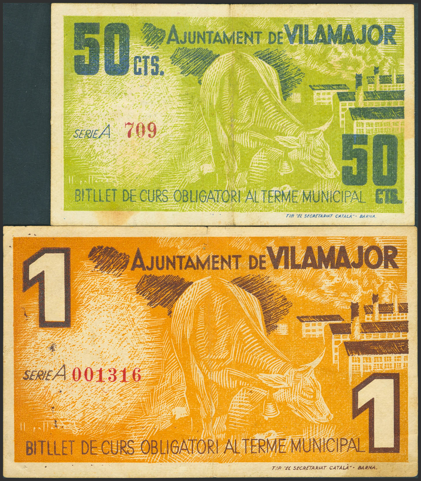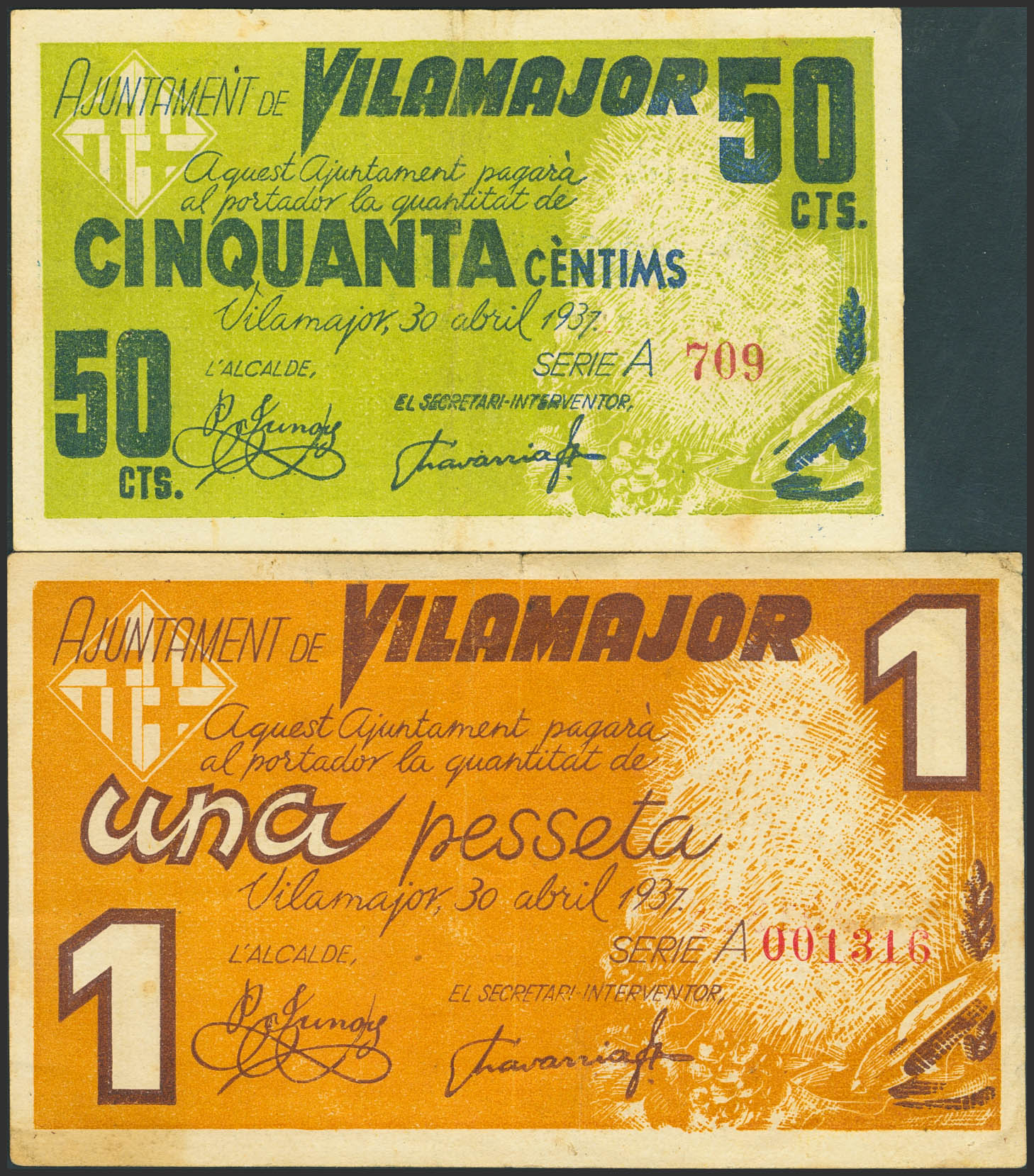 VILAMAJOR (BARCELONA). 50 Céntimos y 1 Peseta. 30 de Abril de 1937. Serie A, ambos. (González: 10766/67). Serie completa. MBC.
