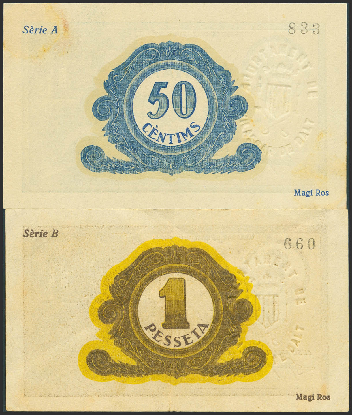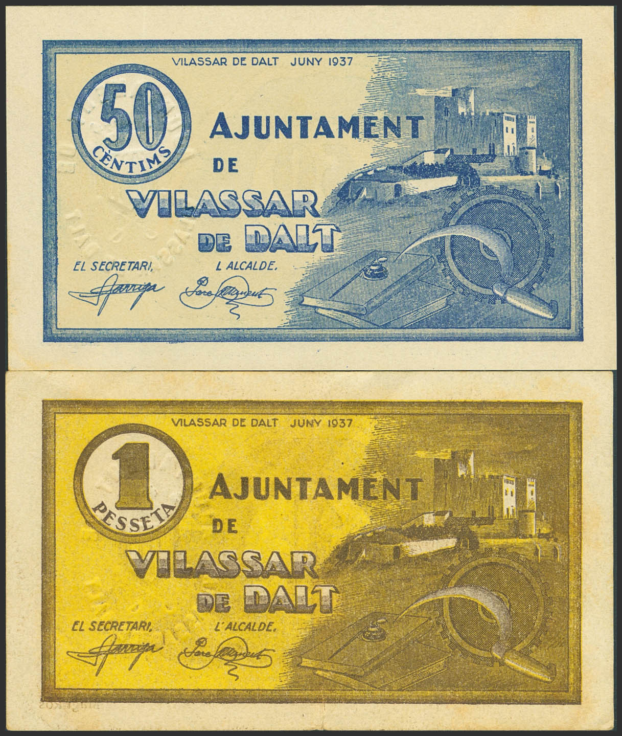 VILASSAR DE DALT (BARCELONA). 50 Céntimos y 1 Peseta. Junio de 1937. Serie A y B, respectivamente. (González: 10852/53). Inusual serie completa. SC-/MBC+.