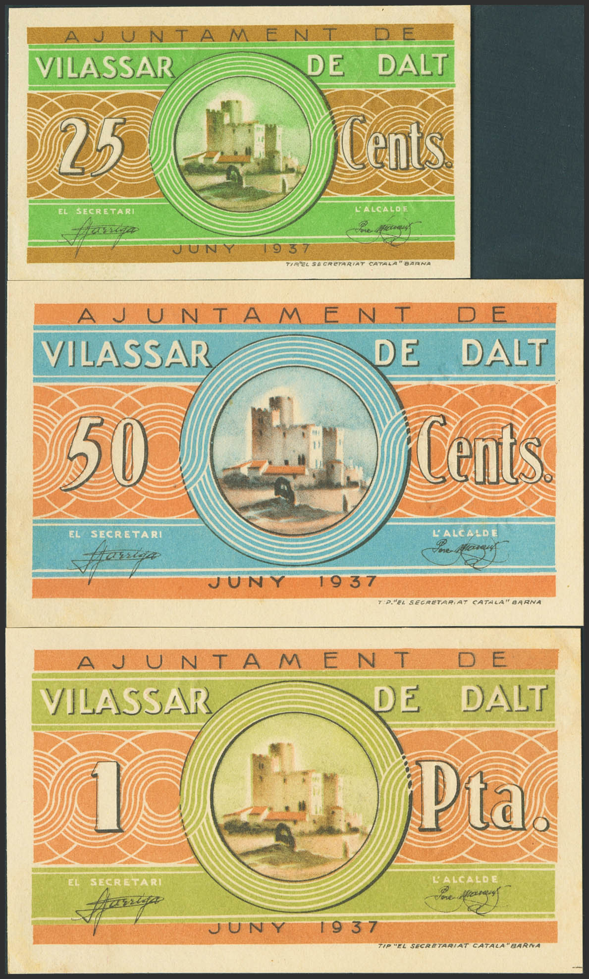 VILASSAR DE DALT (BARCELONA). 25 Céntimos, 50 Céntimos y 1 Peseta. Junio de 1937. (González: 10854/56). Inusual serie completa en esta calidad. SC--.