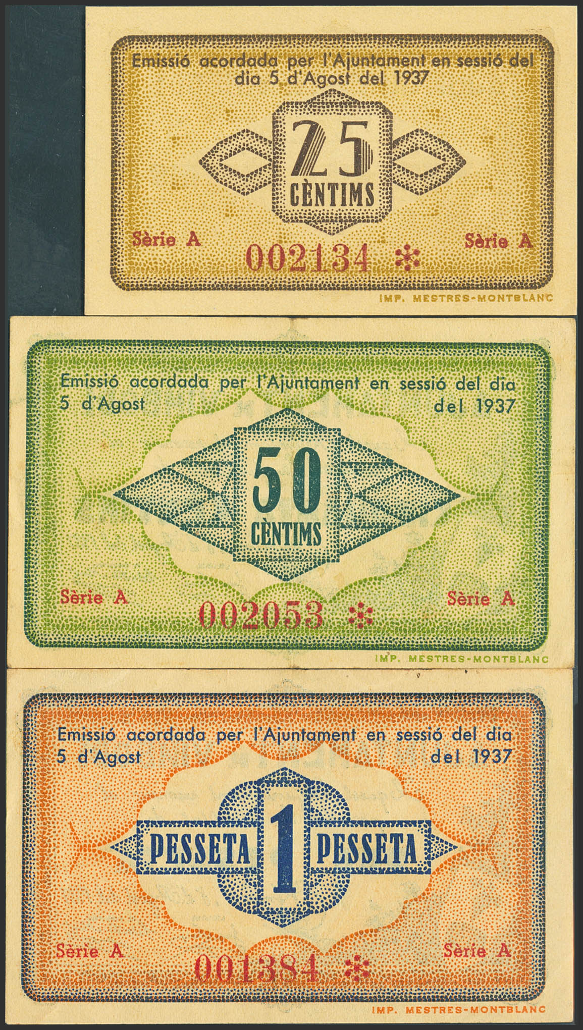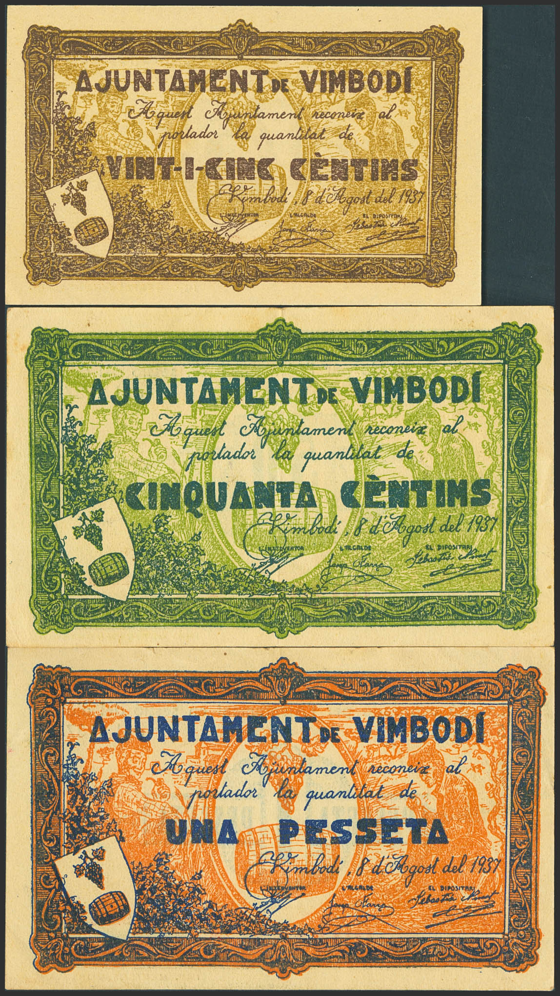 VIMBODI (TARRAGONA). 25 Céntimos, 50 Céntimos y 1 Peseta. 8 de Agosto de 1937. Serie A, todos. (González: 10905/07). Inusual serie completa. EBC/SC-.