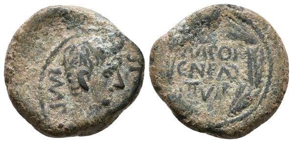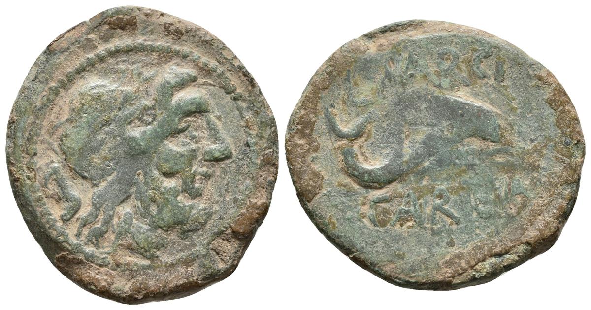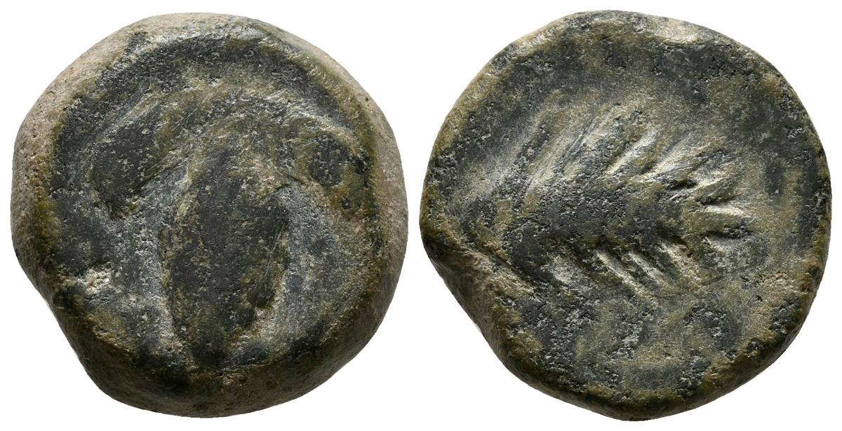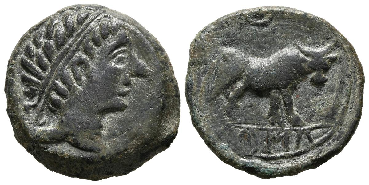 OBULCO (Porcuna, Jaén). As. (Ae. 19,40g/28mm). 220-20 a.C. (FAB-1791). Anv: Cabeza femenina a derecha, delante leyenda: OBVLCO. Rev: Espiga a derecha, debajo espiga a izquierda, entre ellos leyenda: ISCeRATeN/UIUBoLAI, sobre la espiga, letra ibera: Ta. MBC-/BC+.