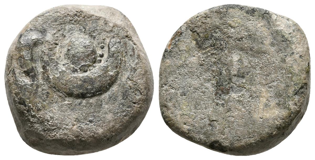 BILBILIS (Calatayud, Zaragoza). Semis. (Ae. 7,39g/21mm). 120-30 a.C. (FAB-267). Anv: Cabeza masculina a derecha, detrás letra ibérica Bi, delante delfín. Rev: Caballo saltando a derecha, encima creciente con punto, debajo leyenda ibérica: BiLBiLIS. MBC-.