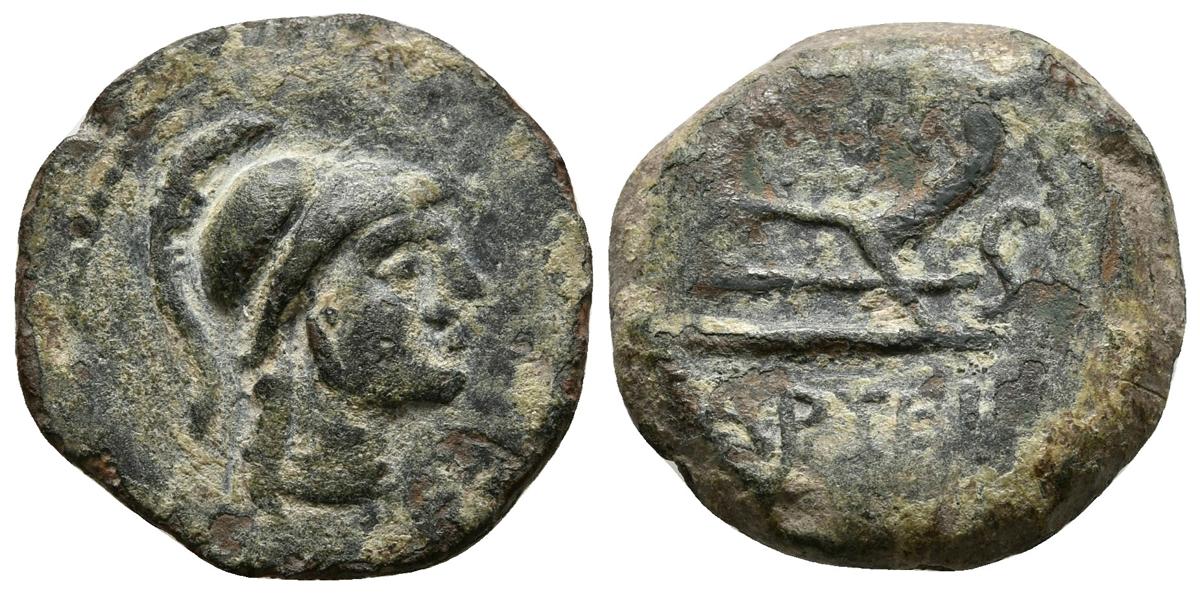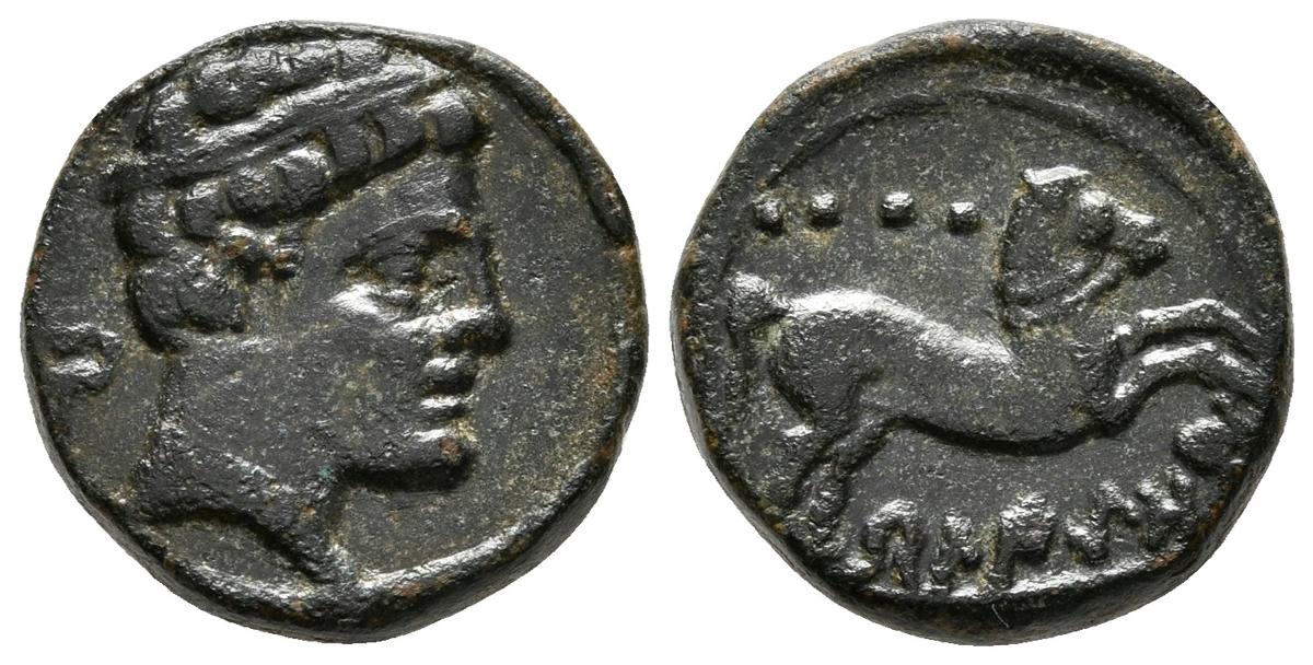 ARSE-SAGUNTO. Obolo. Sagunto (Valencia). 300-200 a.C. A/ Cabeza de caballo a derecha. Delante leyenda "ARSETARKITERTER" R/ Cabeza femenina galeada a derecha. PPR-31. Ar. 0,24g. BC+/MBC-. Escasa.