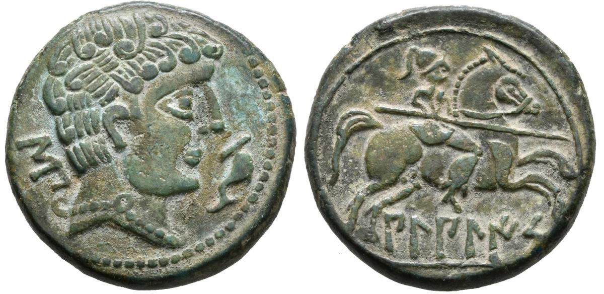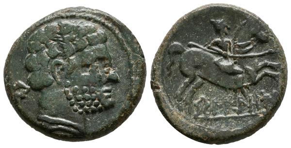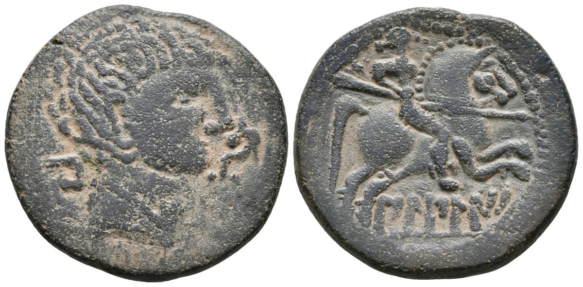 BELIGIOM (Belchite, Zaragoza). As. (Ae. 9,05g/23mm). 120-20 a.C. (FAB-243). Anv: Cabeza masculina barbada a derecha, detrás letra ibérica: Be. Rev: Jinete con lanza a derecha, debajo leyenda ibérica: BeLIGiOM. MBC-. Oxidaciones.