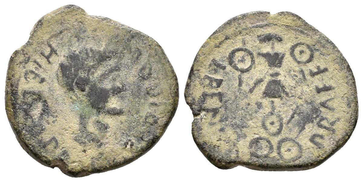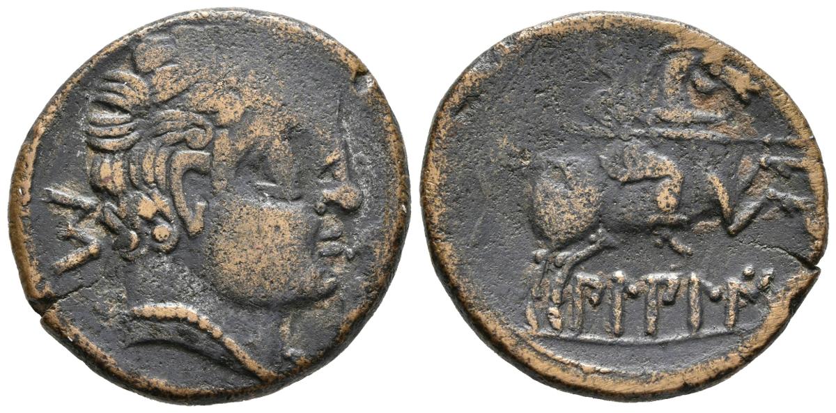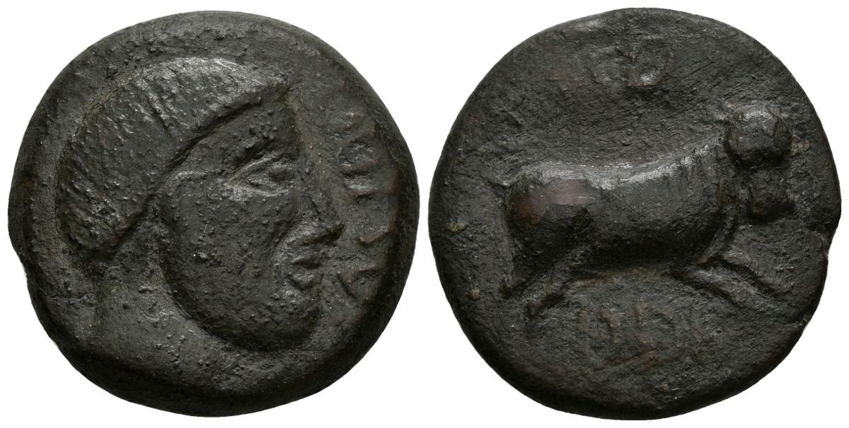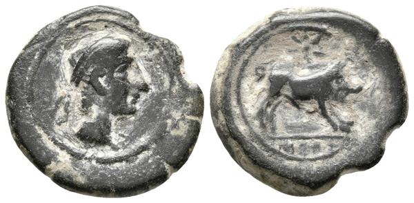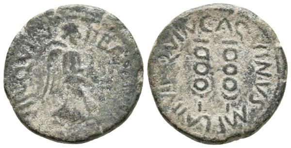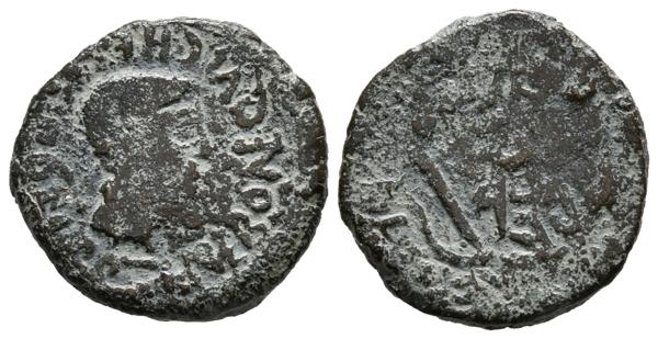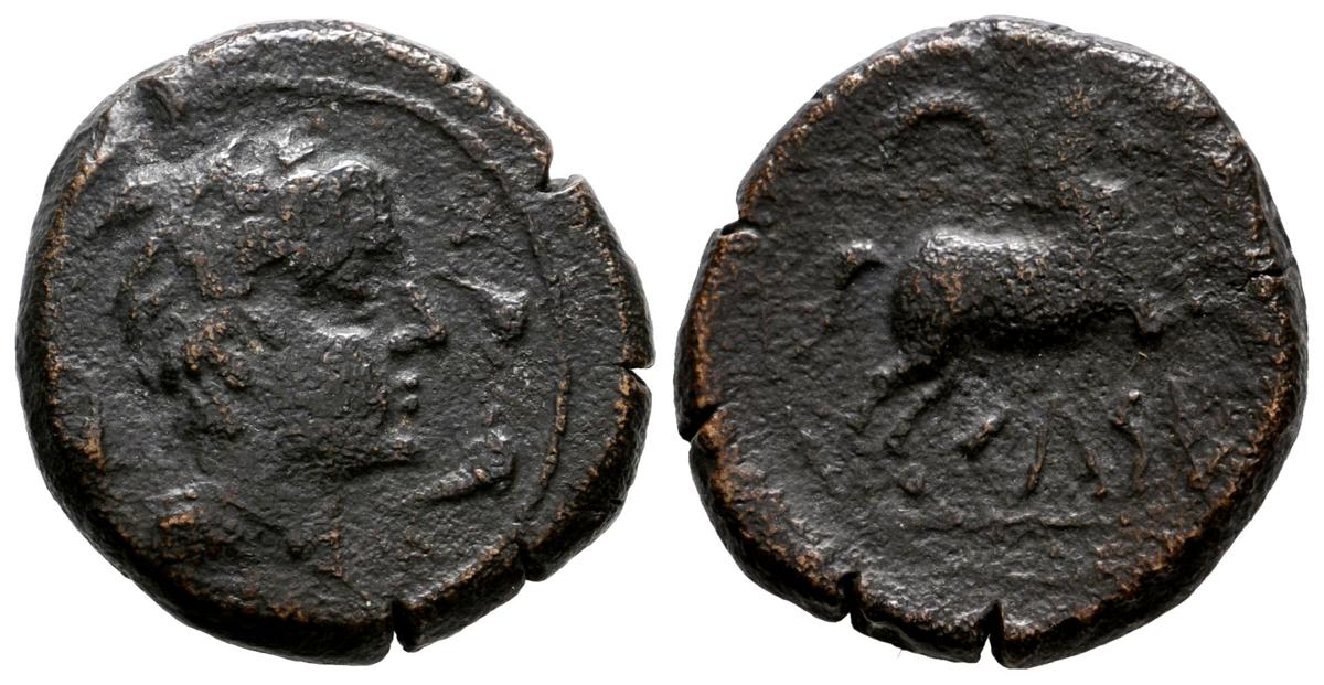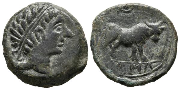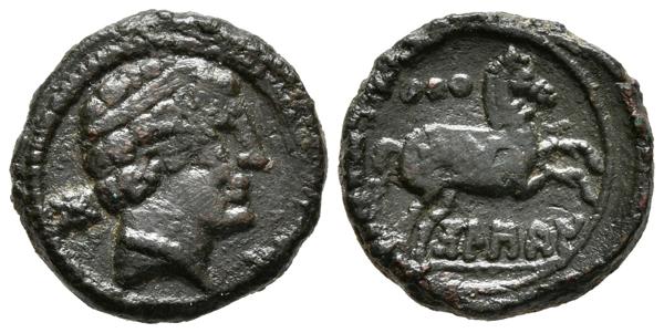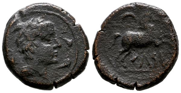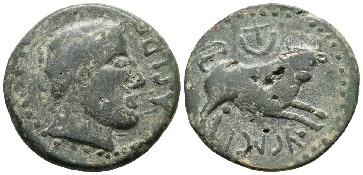 ASIDO. As. 50 a.C. Medina Sidonia (Cádiz). A/ Cabeza masculina a derecha, delante leyenda externa ASIDO. R/ Toro a derecha, encima marca, debajo inscripción libio-fenicia 'SDN. FAB-153. Ae. 14,46g. BC+. Rara.