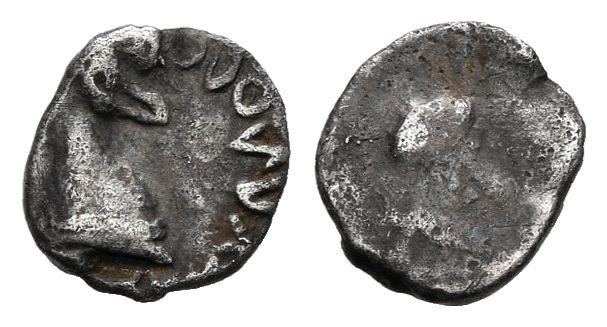 GALIA, Massalia. Obolo de imitación massatolia. (Ar. 0,62g/10mm). 450-410 a.C. (BN 524). Anv: Cabeza con casco a derecha. Rev: Rueda de cuatro radios. MBC+.