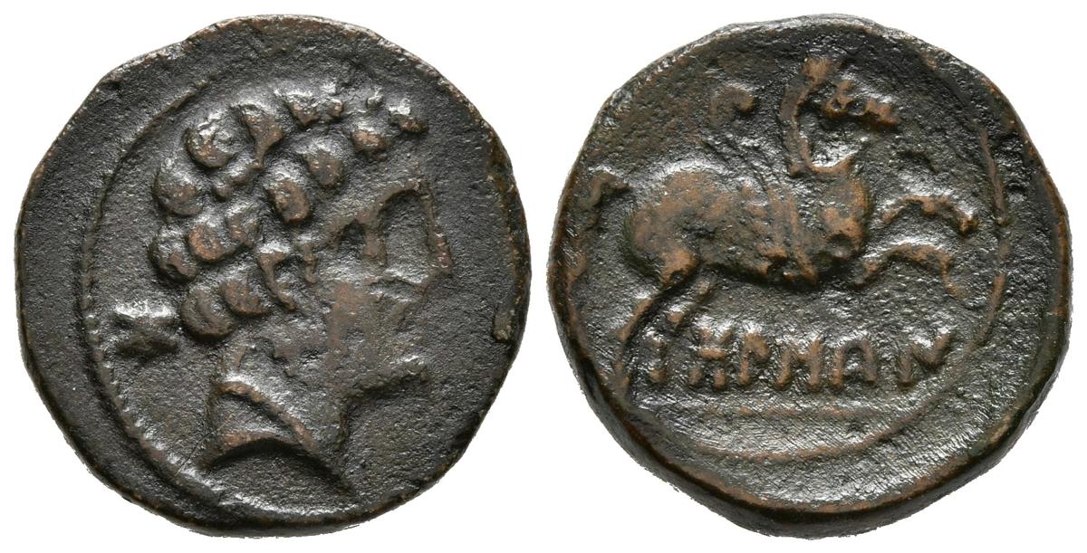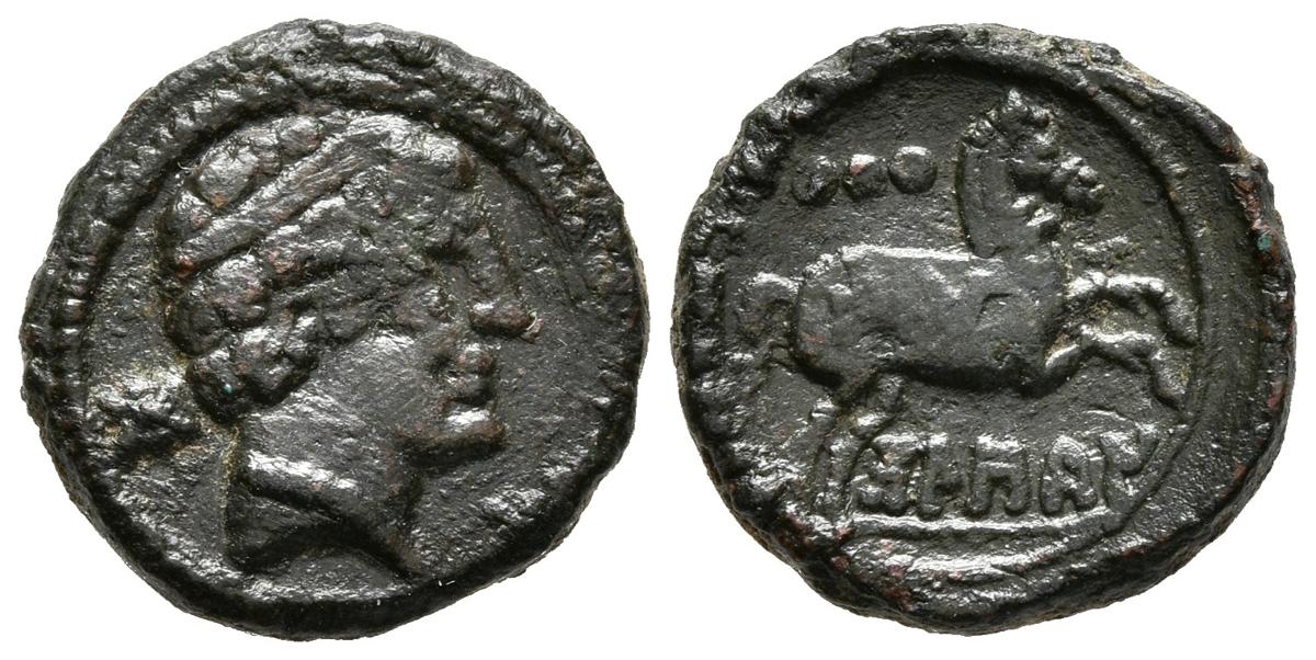 BILBILIS (Calatayud, Zaragoza). Semis. (Ae. 6,19g/21mm). 120-30 a.C. (FAB-267). Anv: Cabeza masculina a derecha, detrás letra ibérica Bi, delante delfín. Rev: Caballo saltando a derecha, encima creciente con punto, debajo leyenda ibérica: BiLBiLIS. BC+/MBC-.