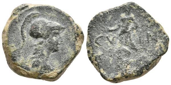 TRACIA, Lysimachos. Ae14. (Ae. 2,35g/14mm). 305-281 a.C. Lysimacheia. (SNG Copenhagen 1159). Anv: Cabeza de Attica con casco a derecha. Rev: Parte delantera de león a derecha, detrás caduceo y letras: ΛΟ, debajo punta de lanza, alrededor leyenda: BAΣΙΛΕΩΣ ΛYΣIMAXOY. MBC.