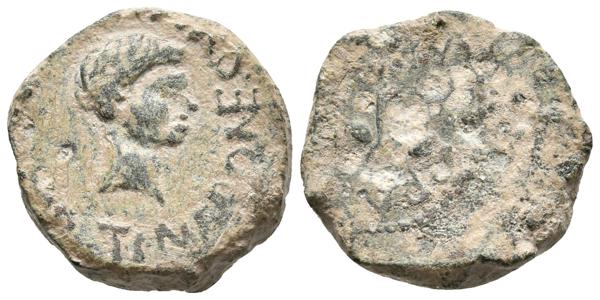 BARSCUNES (Pamplona, Navarra). As. (Ae. 9,72g/23mm). 120-20 a.C. (FAB-223). Anv: Cabeza masculina a derecha, delante delfín. Rev: Jinete con espada a derecha, debajo leyenda ibérica: BaRSCuNES. MBC-. Oxidaciones.