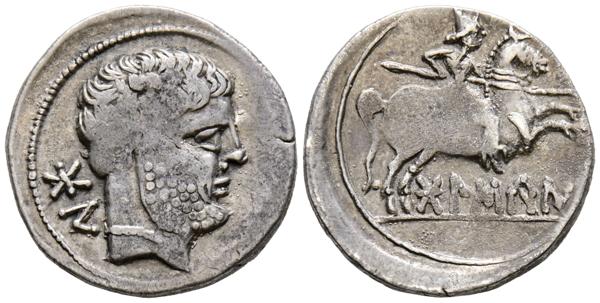BASCUNES (Pamplona). Denario. (Ar. 3,47g/18mm). 120-20 a.C. (FAB-215). Anv: Cabeza masculina barbada a derecha, detrás leyenda ibérica BeNCoDa. Rev: Jinete con espada a derecha, debajo leyenda ibérica BaSCuNES. MBC.