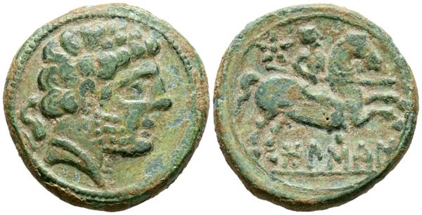 BARSCUNES (Pamplona, Navarra). As. (Ae. 10,77g/26mm). 120-20 a.C. (FAB-223). Anv: Cabeza masculina a derecha, delante delfín. Rev: Jinete con espada a derecha, debajo leyenda ibérica: BaRSCuNES. BC.