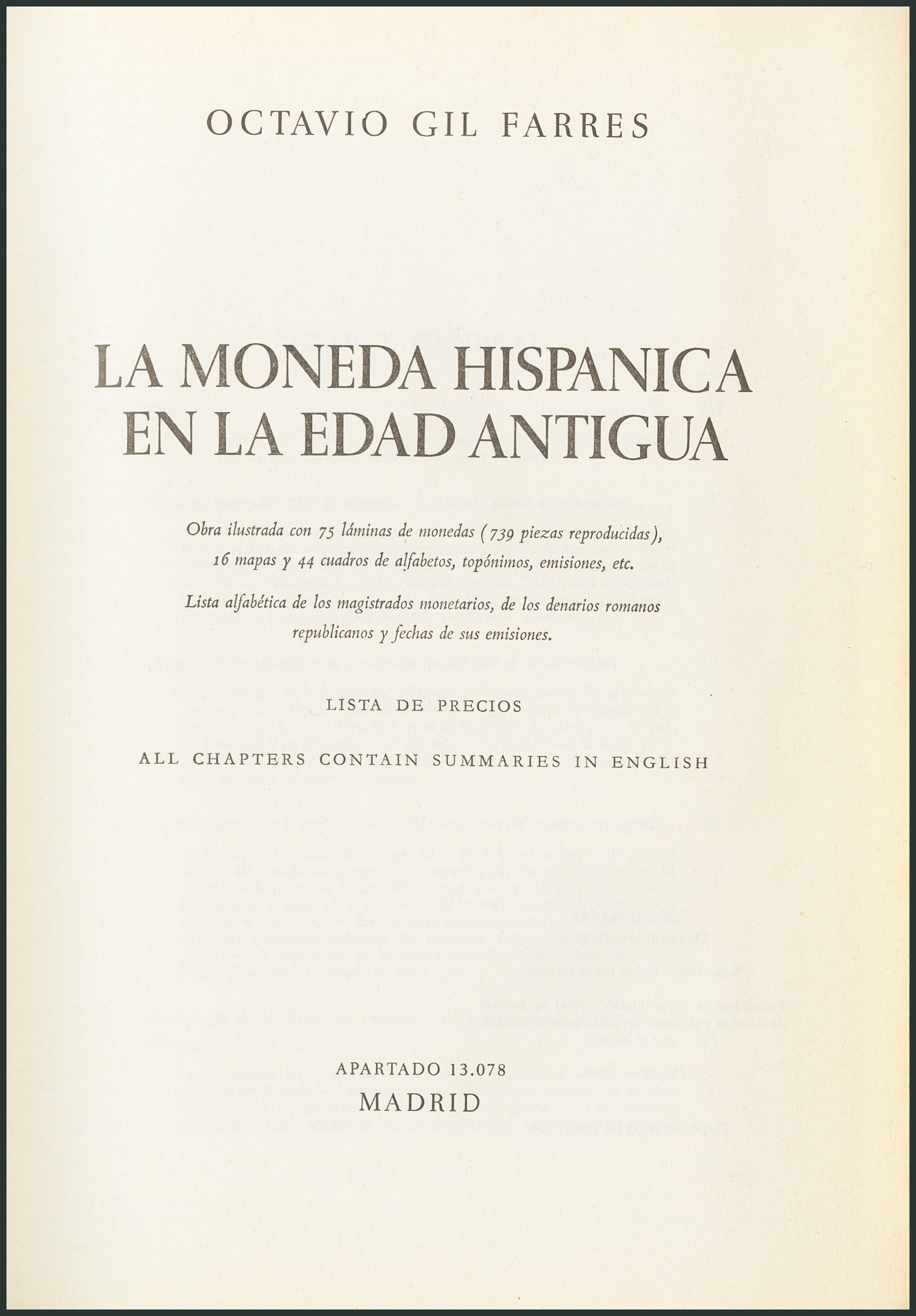 LA MONEDA HISPANICA EN LA EDAD ANTIGUA. Edificón: 1966. Autor: Octavio Gil Farrés. Bien conservado.