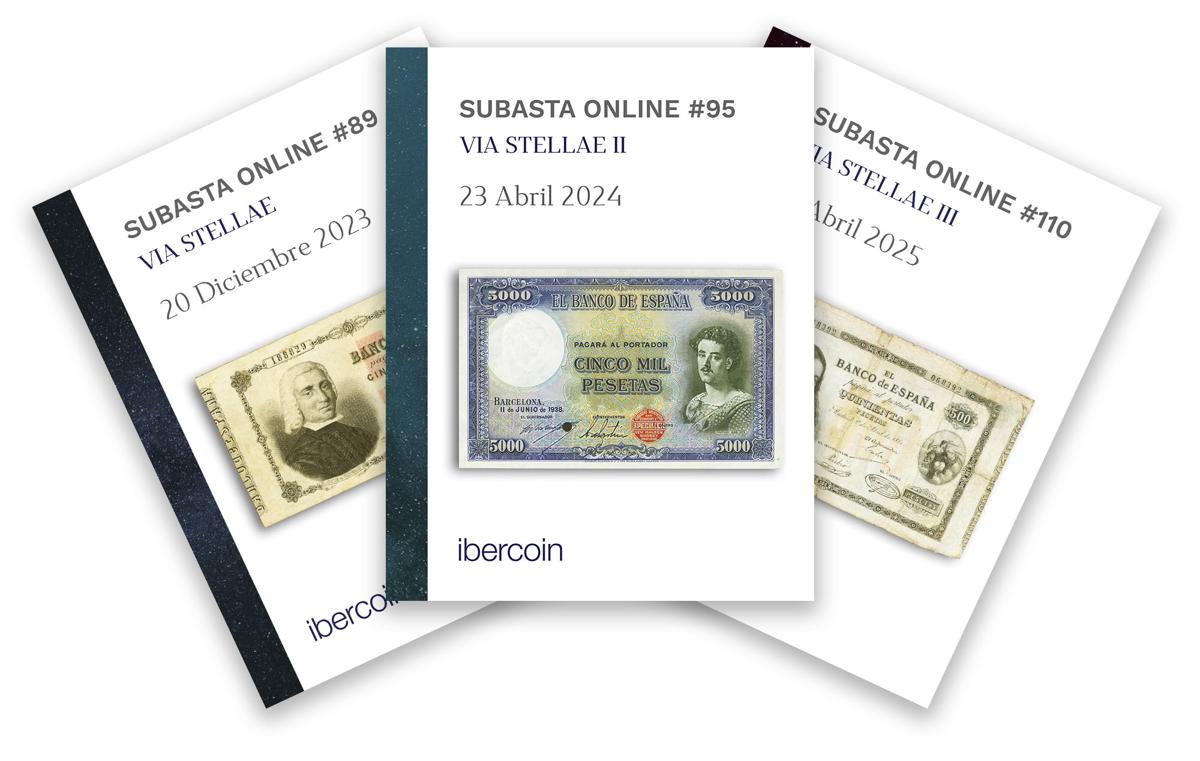 Trilogía completa con cajetín de los catálogos de subasta que componen la colección Via Stellae dedicada a la notafilia española subastada por Ibercoin en los años 2023, 2024 y 2025, se trata sin duda de una de las colecciones más importantes del billetario español y cuya referencia no debe faltar en ninguna biblioteca notafílica.