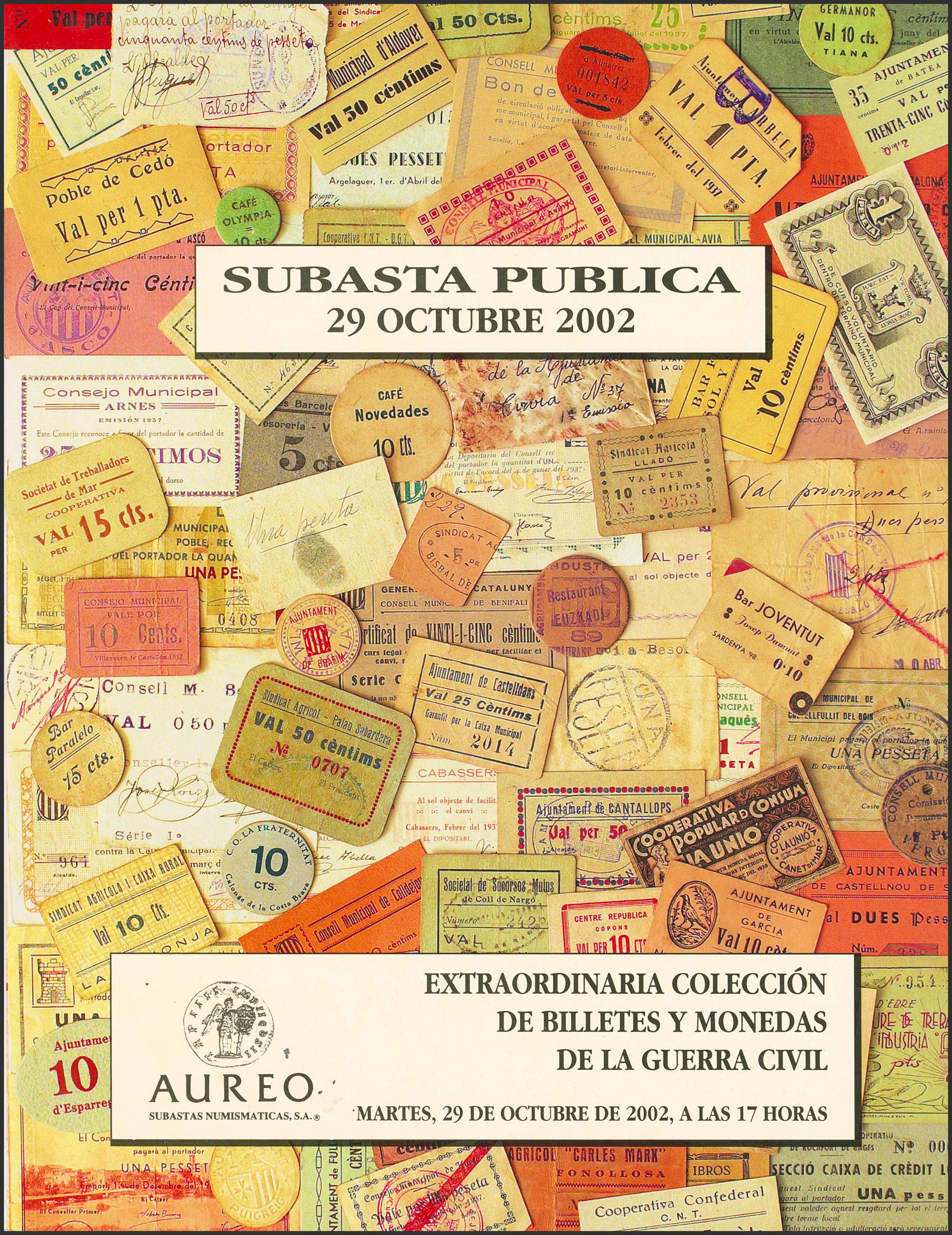 CATALOGO DE SUBASTA DE UNA EXTRAORDINARIA COLECCION DE BILLETES Y MONEDAS DE LA GUERRA CIVIL, realizada por Aureo el 29 de Octubre de 2002.