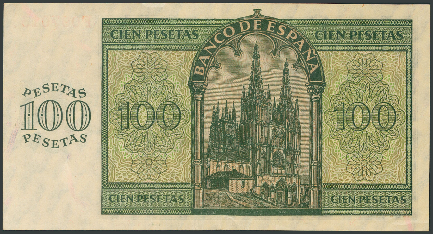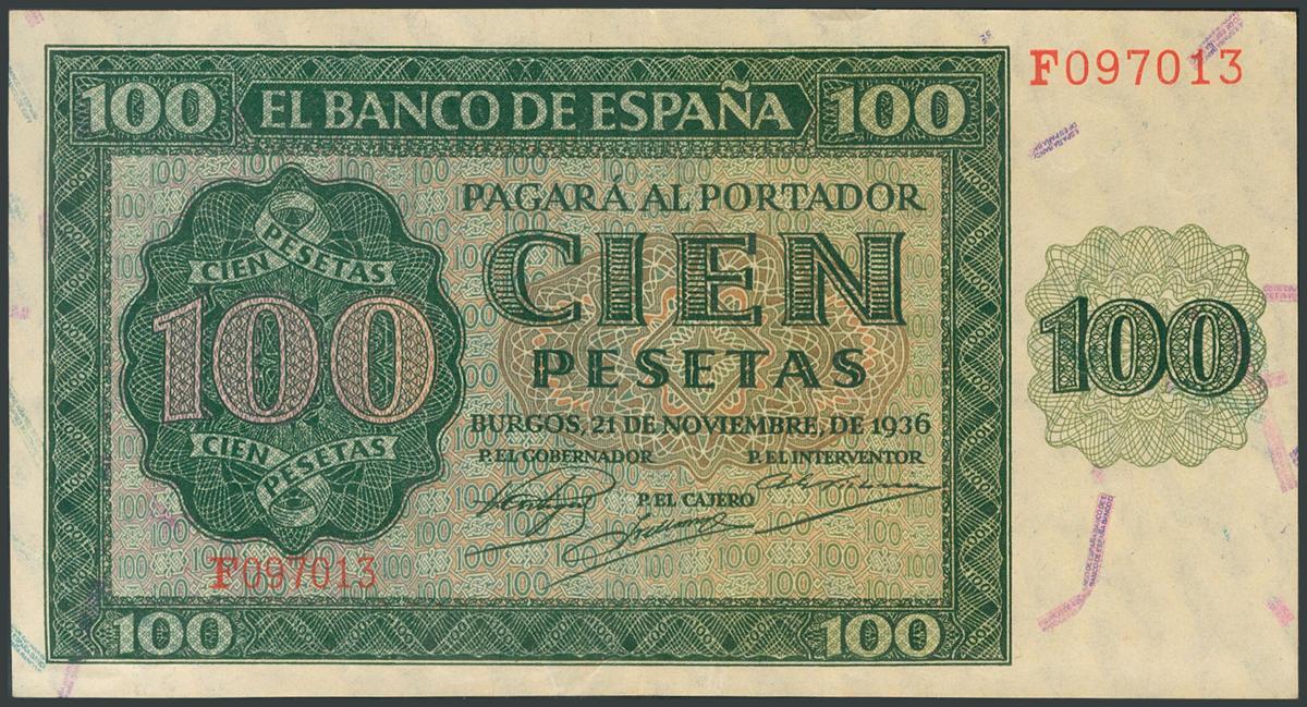 100 Pesetas. 21 de Noviembre de 1936. Serie F. (Edifil 2017: 421a). Conserva buena parte del apresto original. EBC.