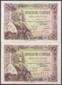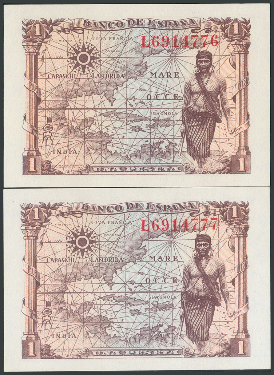 1 Peseta. 15 de Junio de 1945. Pareja correlativa. Serie L. (Edifil 2017: 448a). Apresto original. SC.