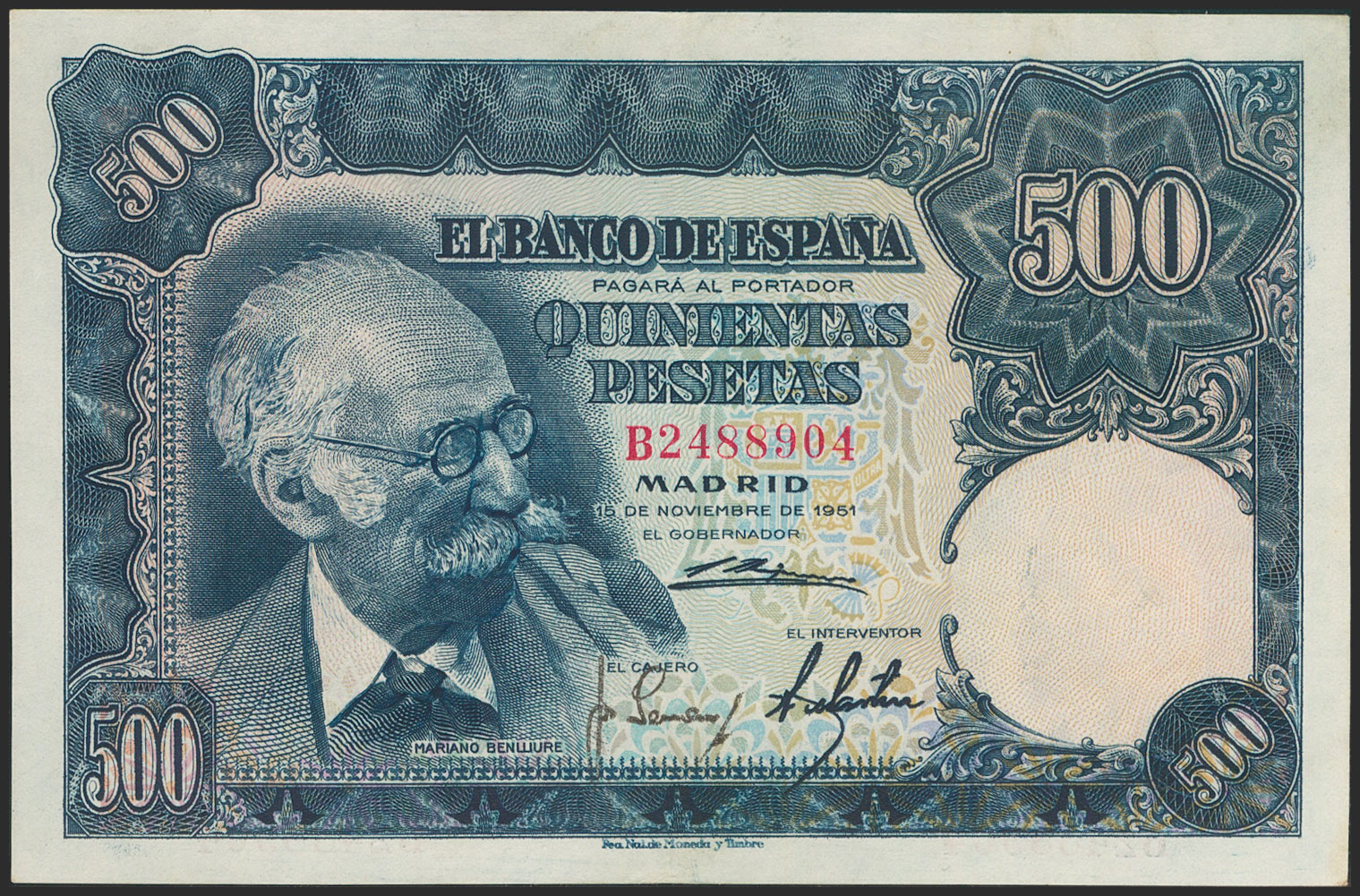 500 Pesetas. 15 de Noviembre de 1951. Serie B. (Edifil 2021: 460a). Presenta parte del apresto original. EBC+.