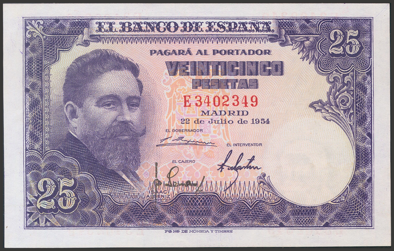 25 Pesetas. 22 de Julio de 1954. Serie E. (Edifil 2017: 467a). Apresto original. SC-.
