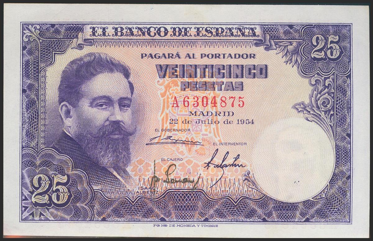 25 Pesetas. 22 de Julio de 1954. Serie A. (Edifil 2021: 467a). Apresto original. SC-.