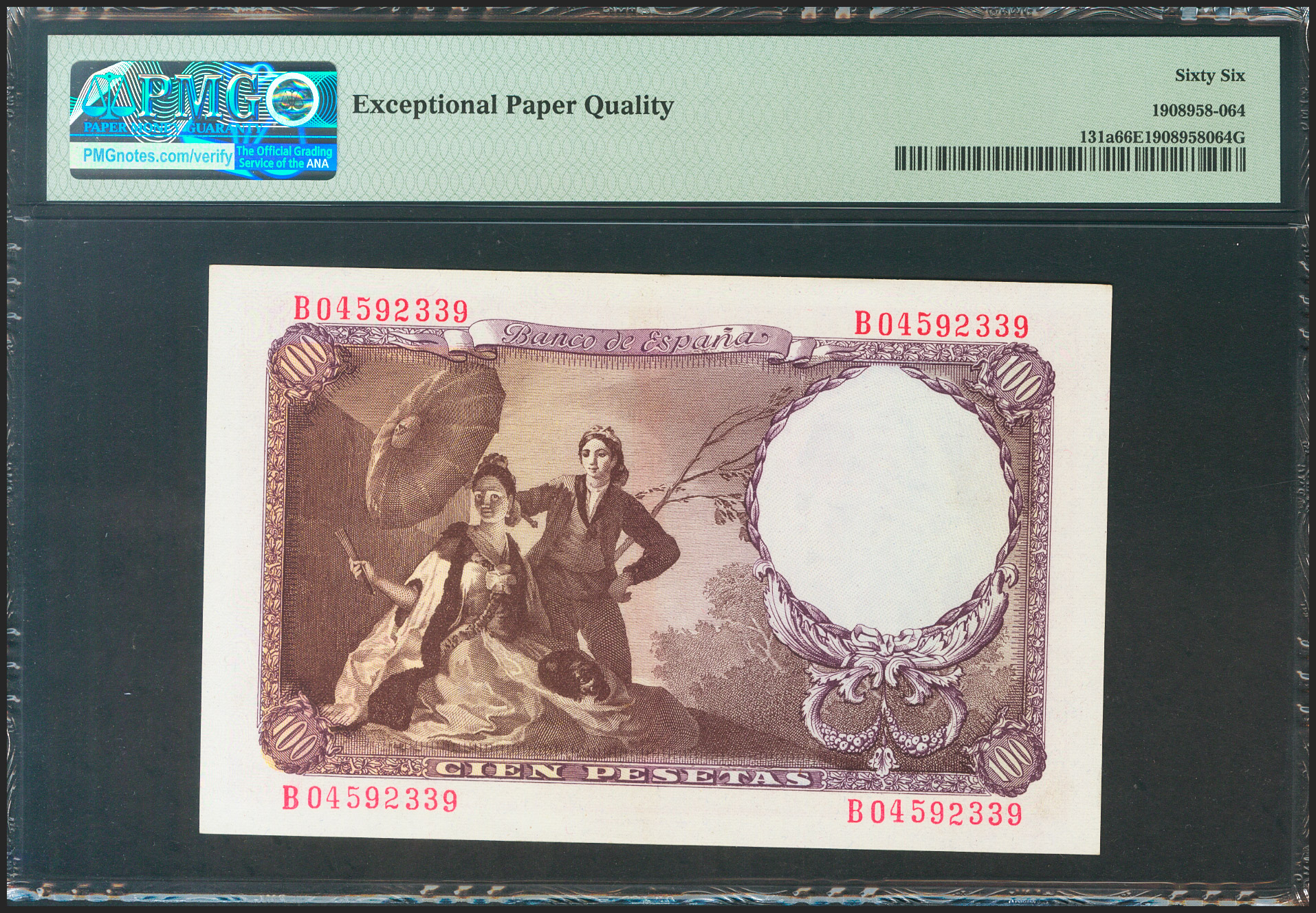 100 Pesetas. 19 de Febrero de 1946. Serie B. (Edifil 2021: 451, Pick: 131a). Raro en esta calidad, apresto original. SC. Encapsulado PMG66EPQ.